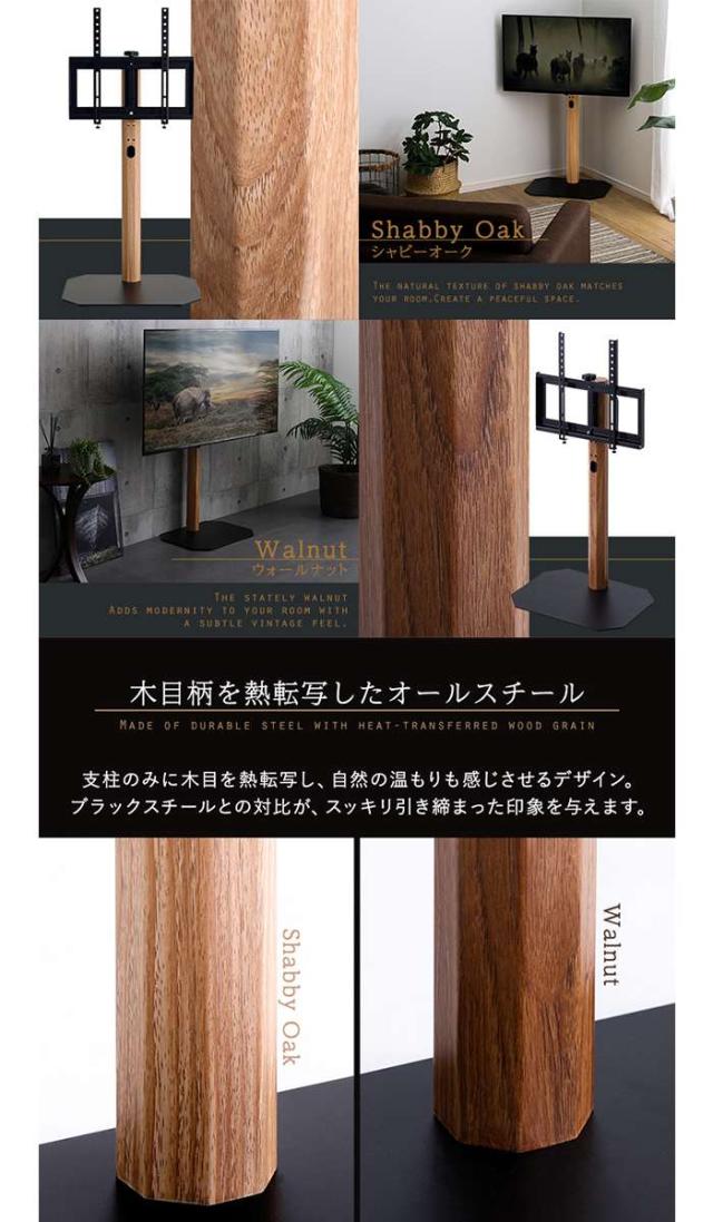 テレビスタンド ロータイプ。カラーは、シャビーオーク(4535306221560:OTGT--SBO)、ウォールナット(4535306221577:OTGT--WAL)、です。テレビスタンド。ヴィンテージカラー(ウォールナット、シャビーオーク)をスチール支柱に木目を転写したスタイリッシュなデザインの八角テレビスタンド ロータイプです。ブラック×木目のオールスチール素材はインパクトがあり、お部屋の雰囲気がガラッと変わります。支柱内部にコードを通す穴が空いているので、スッキリ見せれます。240度のスイングタイプで32?65インチのテレビを取付できます。高さは3段階調整可能でお好みの高さに設定できます。