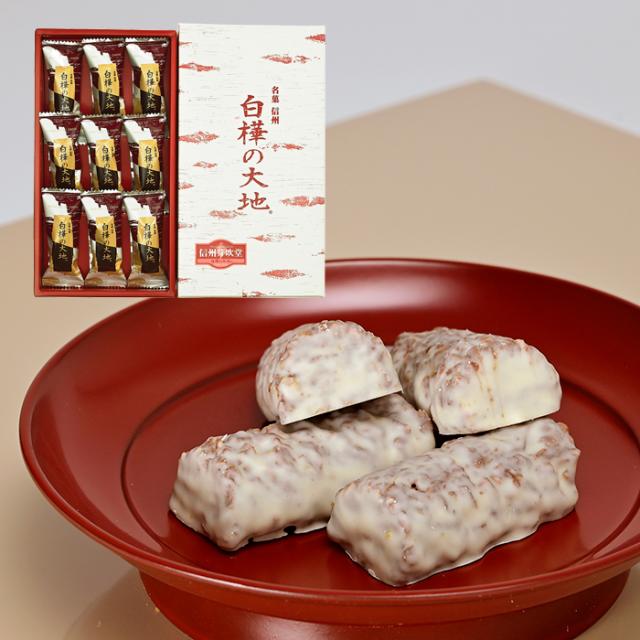 「白樺の大地」はミルクチョコレートにゴーフレットクラムをちりばめ、ホワイトチョコレートでコーティングしたチョコレート菓子。信州白樺の木をイメージして作ったお菓子です。