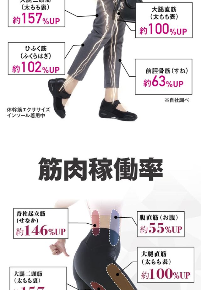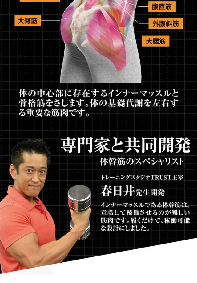 体幹筋は意識して稼働させるのが難しい筋肉です。履くだけで稼働可能な設計にしています。体幹筋とは、体の中心部に存在するインナーマッスルと骨格筋をさし、体の基礎代謝を左右する重要な筋肉です。