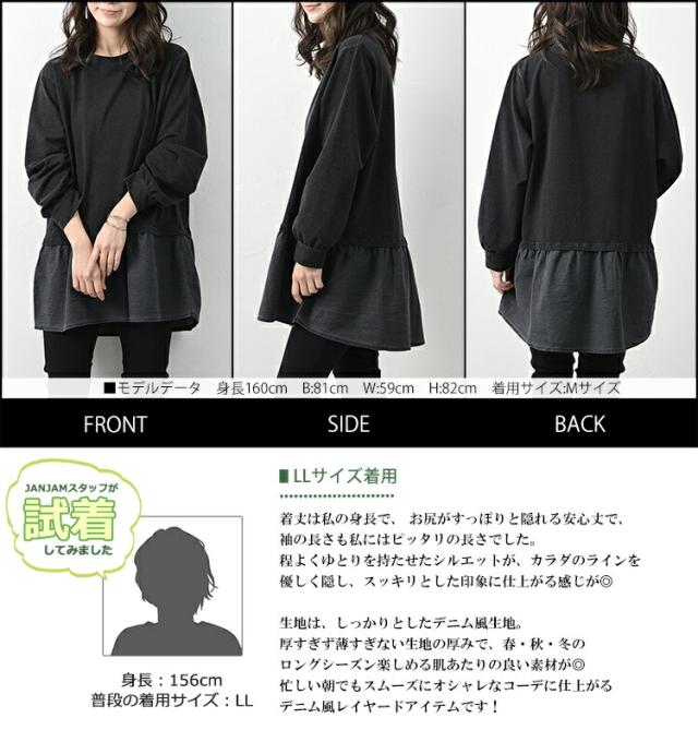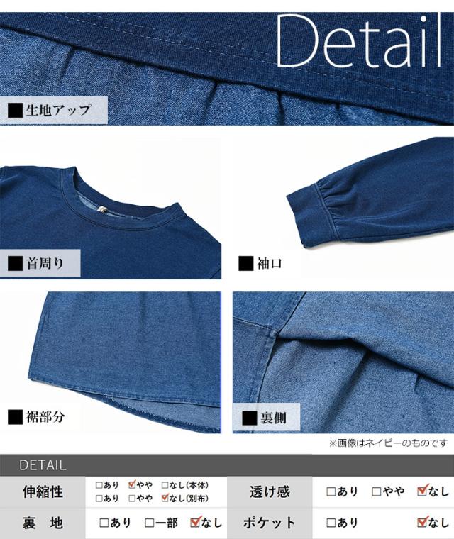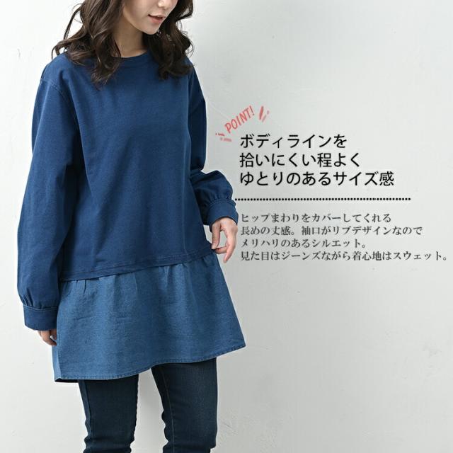 お洒落な重ね着風 カットデニムプルオーバー。 デニム風切り替え裾が ヒップまわりをカバーする長めの丈感。 ロングシーズン楽しめる 肌あたりの良い生地感がポイントの1枚です。 |