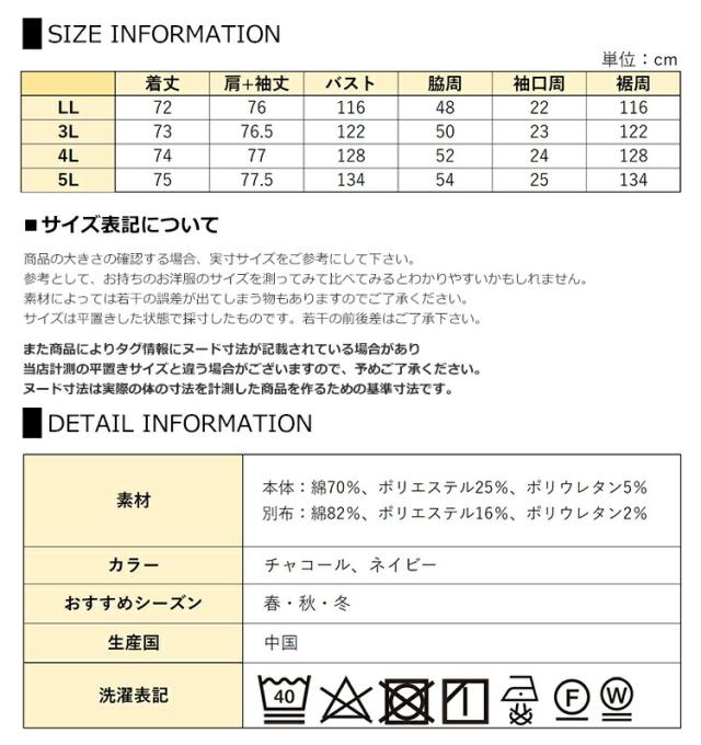 LL:着丈72 肩+袖丈76 バスト116 脇周48 袖口周22 裾周116