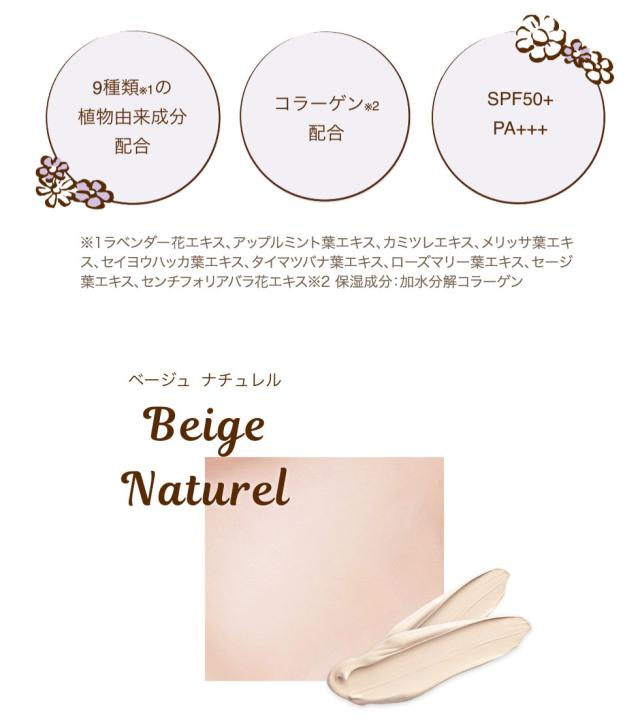 水、DPG、メトキシケイヒ酸エチルヘキシル、 シクロペンタシロキサン、サリチル酸エチルヘキシル、シクロヘキサシロキサン、グリセレス-26、トリエチルヘキサノイン、イソドデカン、セチルPEG/PPG-10/1ジメチコン、ヘキサ(ヒドロキシステアリン酸/ステアリン酸/ロジン酸)ジペンタエリスリチル、t-ブチルメトキシジベンゾイルメタン、トリメチルシロキシケイ酸、PVP、ナイロン-12、サリチル酸ブチルオクチル、硫酸Mg、ナイアシンアミド、オリーブ油脂肪酸ソルビタン、セスキオレイン酸ソルビタン、ステアリルジメチコン、シリカ、ポリプロピルシルセスキオキサン、タルク、マイカ、ジステアルジモニウムヘクトライト、(ジメチコン/ビニルジメチコン)クロスポリマー、水酸化Al、トリエトキシカプリリルシラン、ミネラルオイル、トロメタミン、カプリリルグリコール、ジメチコン、メチコン、カプリルヒドロキサム酸、グリセリン、BG、アデノシン、EDTA-2Na、1,2-ヘキサンジオール、炭酸プロピレン、ヒアルロン酸Na、加水分解コラーゲン、ラベンダー花エキス、アップルミント葉エキス、カミツレエキス、メリッサ葉エキス、セイヨウハッカ葉エキス、タイマツバナ葉エキス、ローズマリー葉エキス、セージ葉エキス、センチフォリアバラ花エキス、酸化チタン、酸化鉄