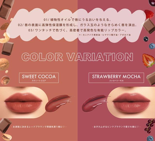 唇の表面に高弾性保湿膜を形成し、ガラス玉のようなきらめく唇を演出!唇のしっとりしたうるおいも長続きします。