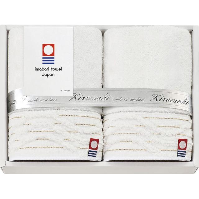 お肌になじみ、水分をしっかり吸収してくれるのでとても使いやすく贈り物に最適です。金糸・銀糸を使うことでさりげない豪華さと気品をそなえています。タオルの名産地「今治」から純白のタオルに気品をのせて。