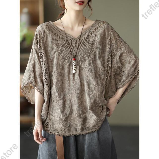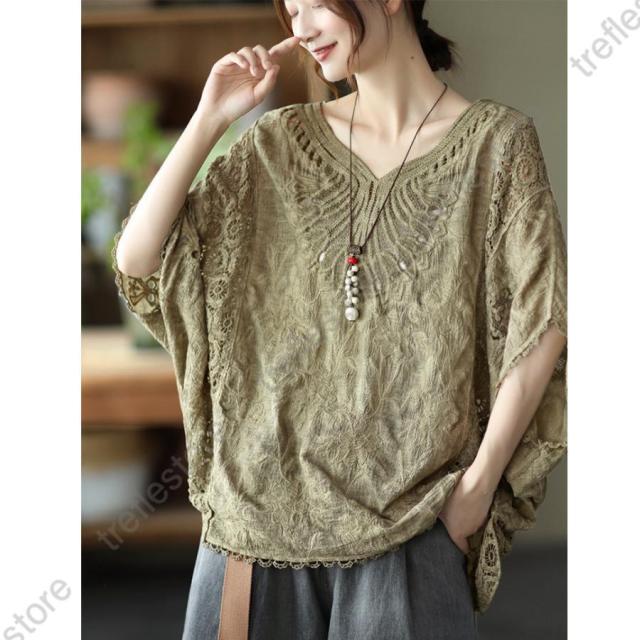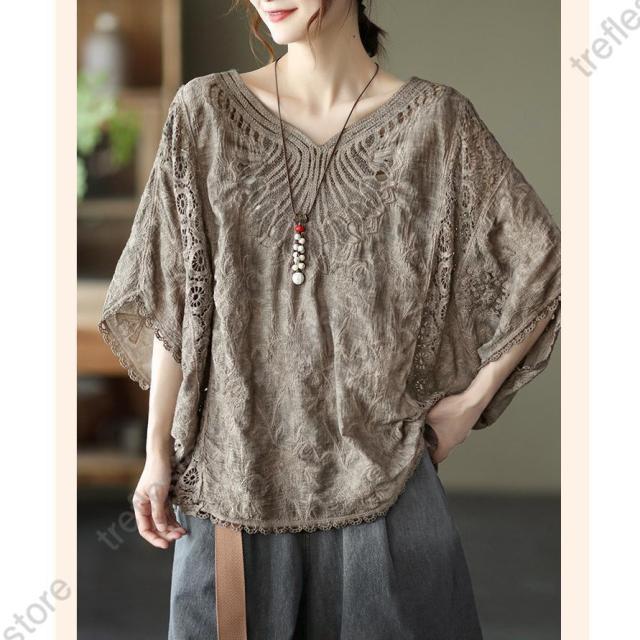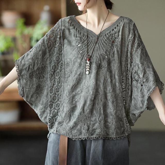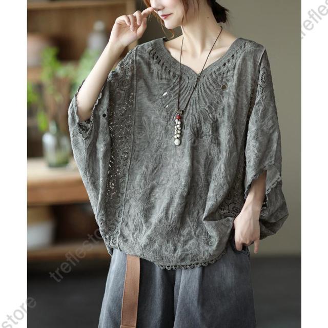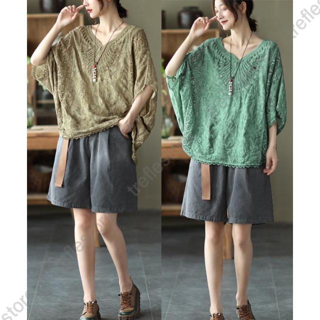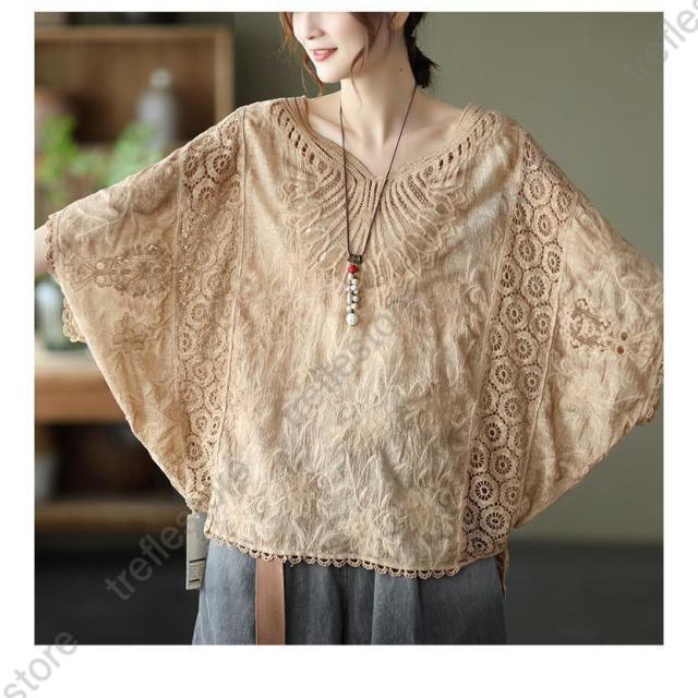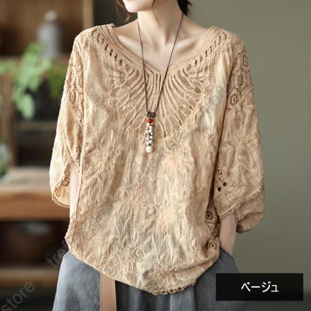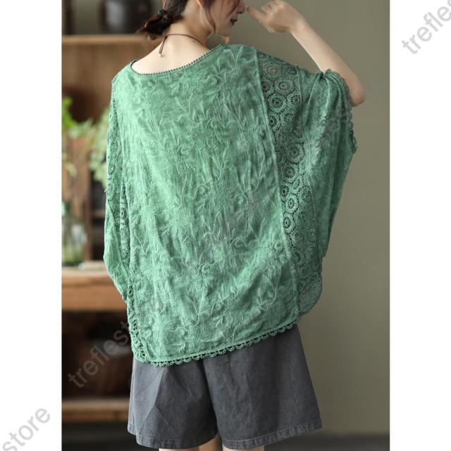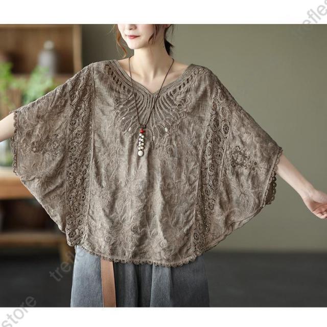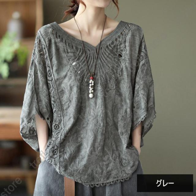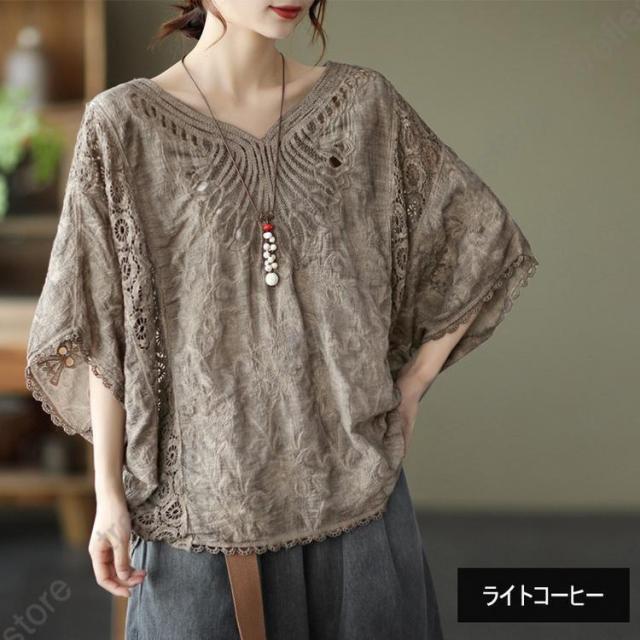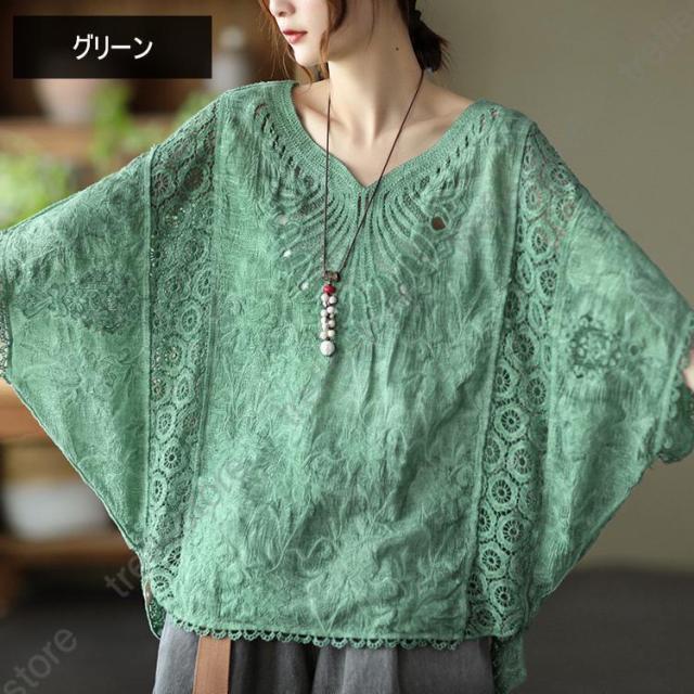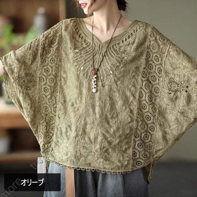 【ポイント5倍!】ブラウス ドルマンスリーブ 総レース 刺繍 フラワー 透け感 体型カバー レディース
