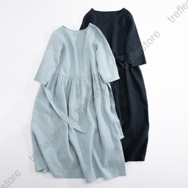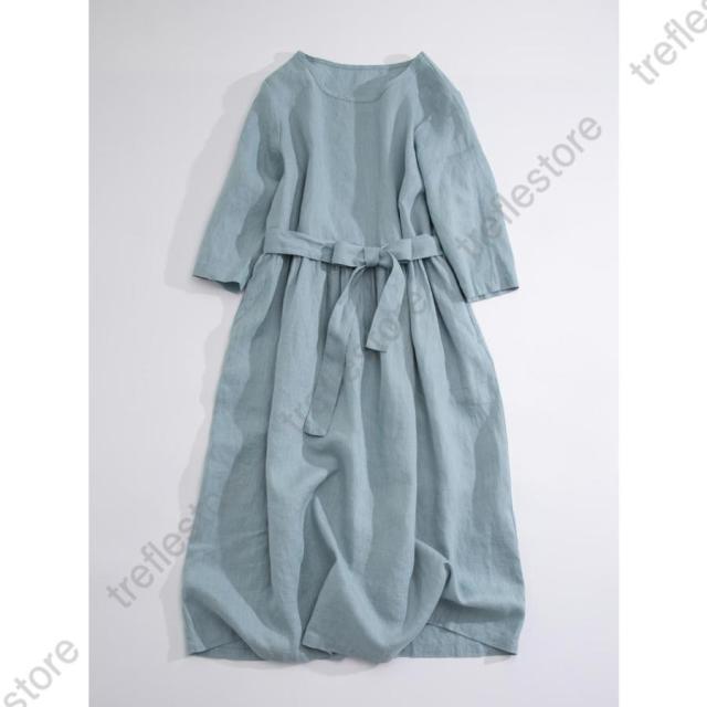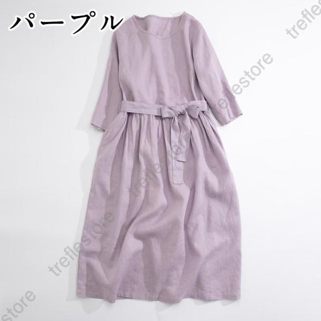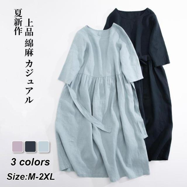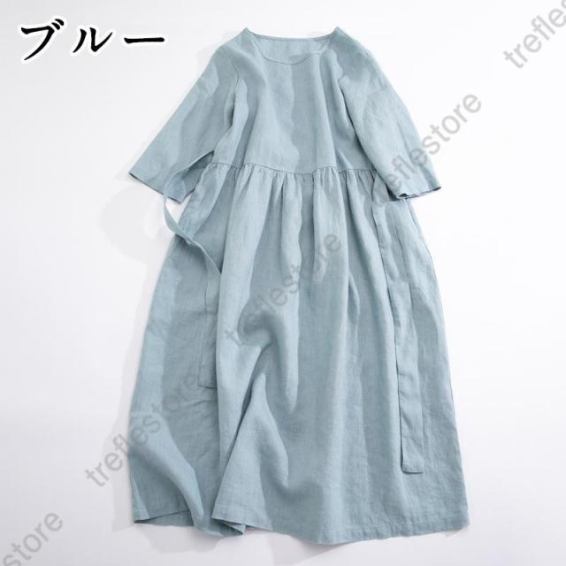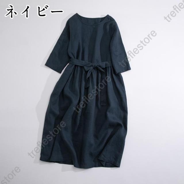 【ポイント5倍!】ワンピース リネンワンピース レディース ロングワンピース 綿麻 七分袖 シンプル 体型カバー ゆるシルエット 無地 きれいめ 春夏