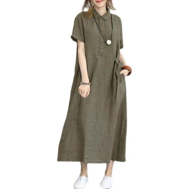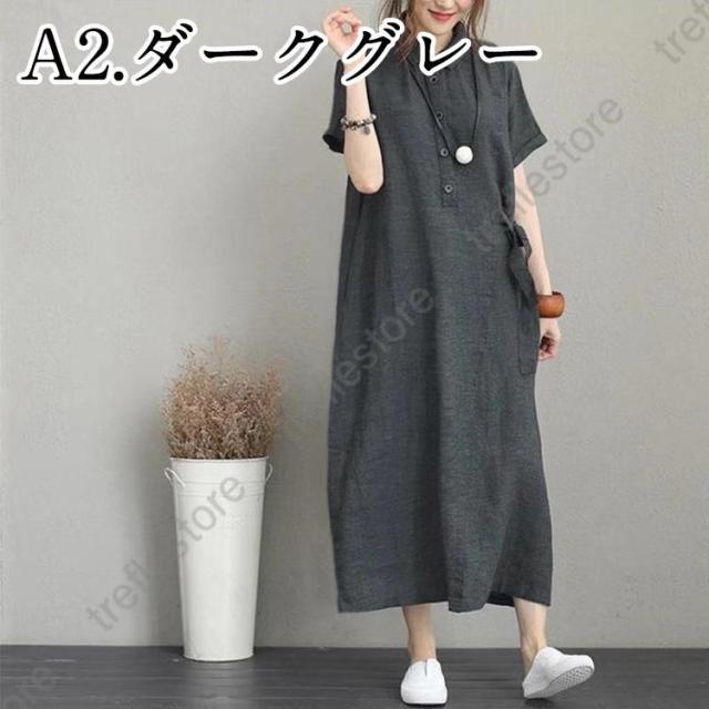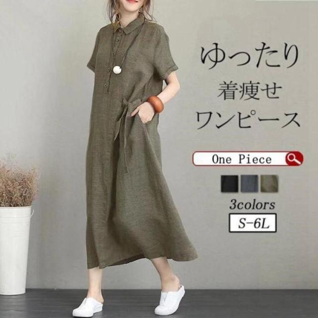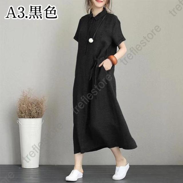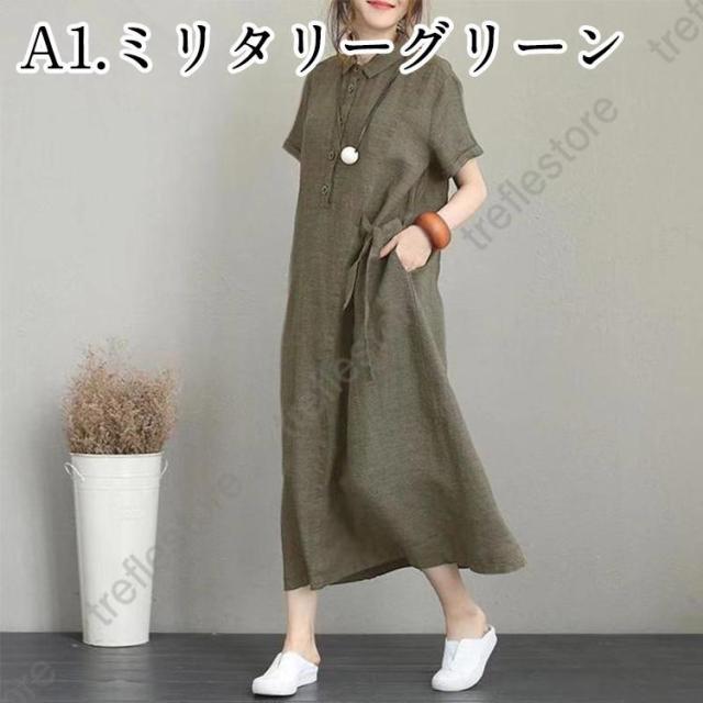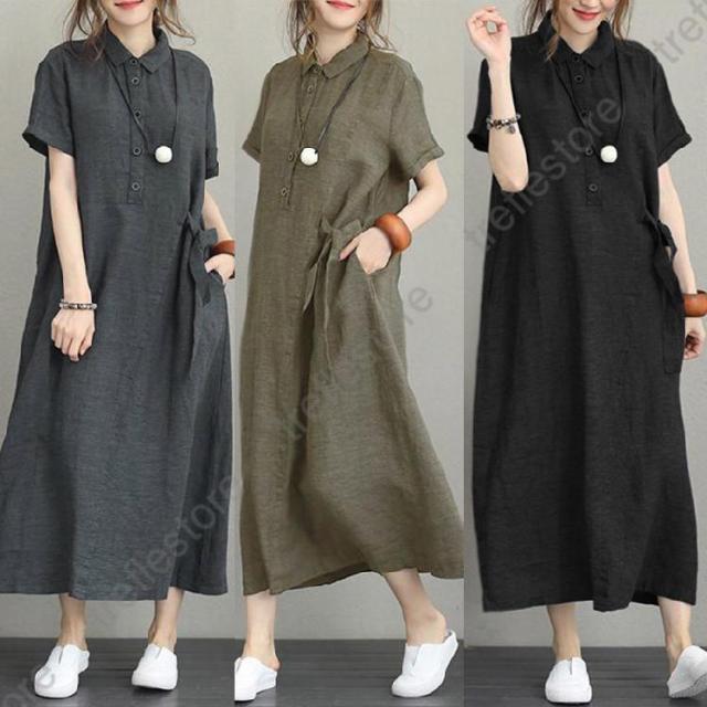 【ポイント5倍!】シャツワンピース レディース 夏 綿麻 ワンピース 40代 50代 折り襟 半袖 ロングワンピース 無地 韓国風 ゆったり 通勤 カジュアル 大きいサイズ 全3色