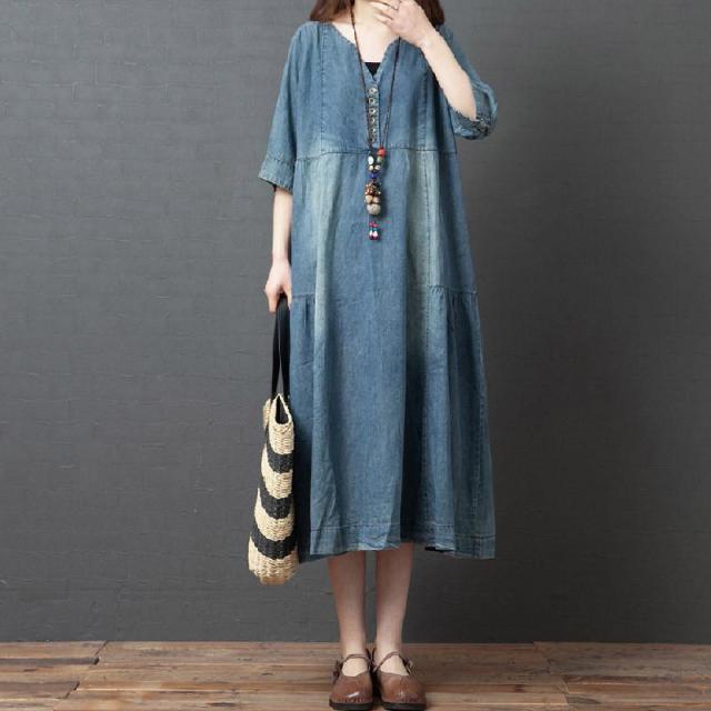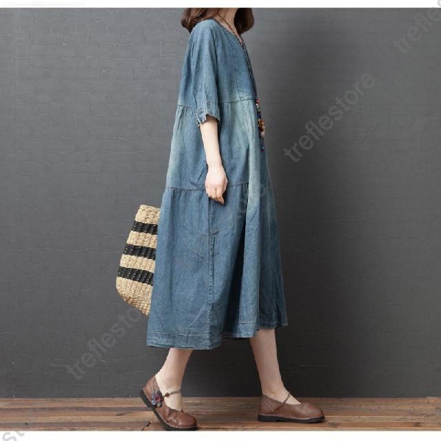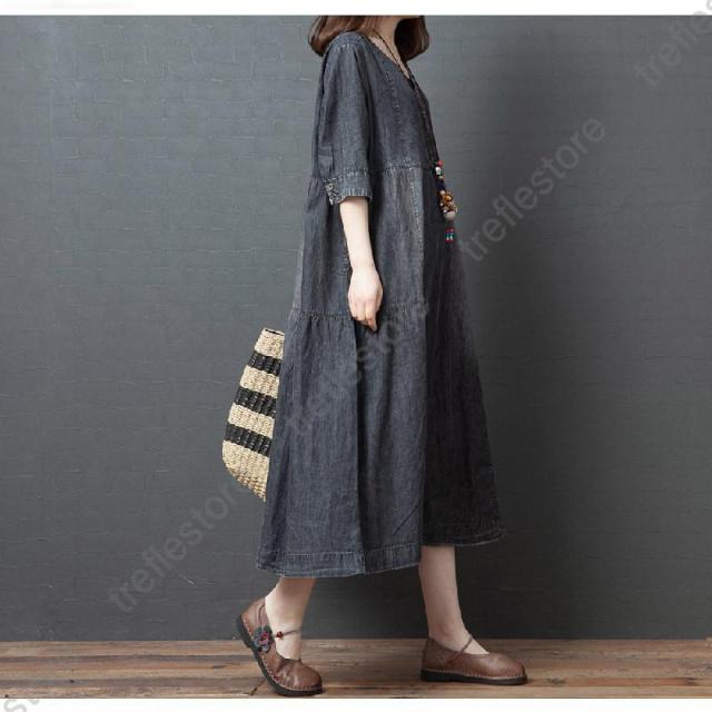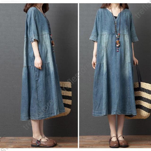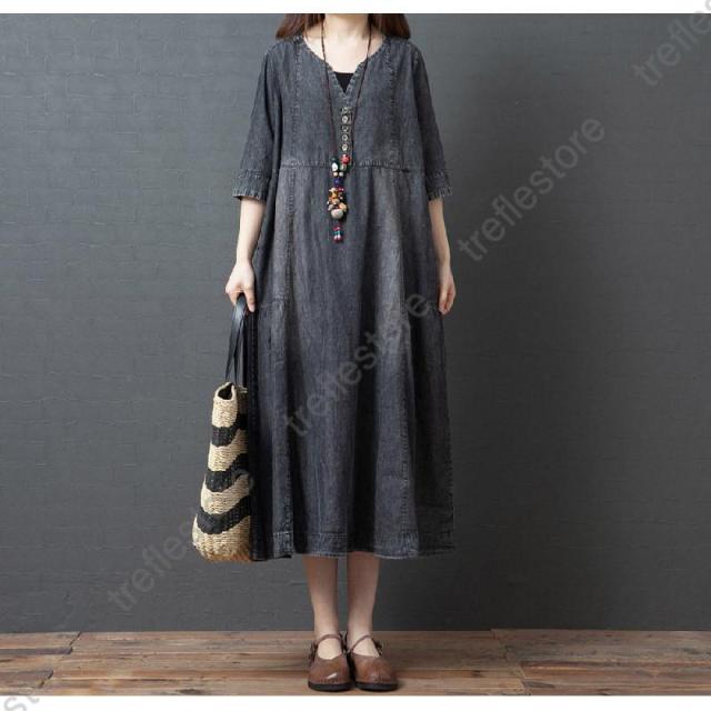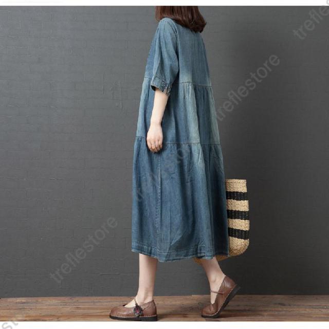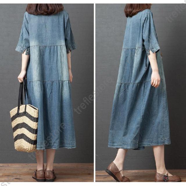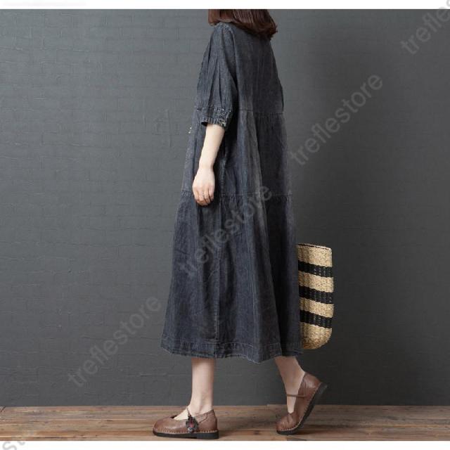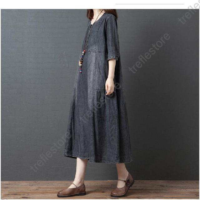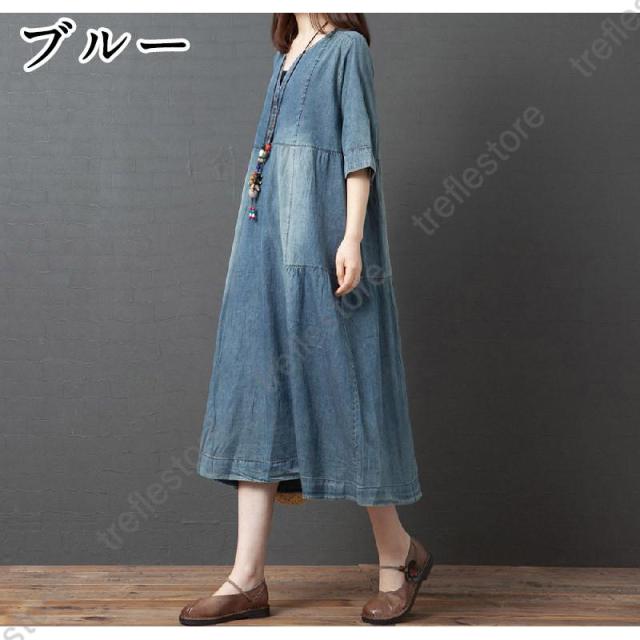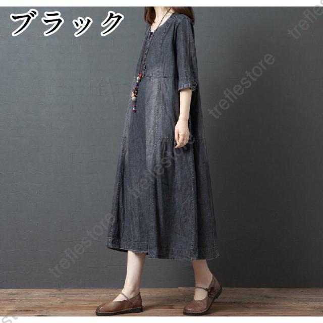 【ポイント5倍!】ワンピース レディース マキシ丈 デニムワンピース ロングワンピース 半袖 大きいサイズ 着痩せ 体型カバー 通勤 OL お出かけ 春夏 30代/40代/50代/60代