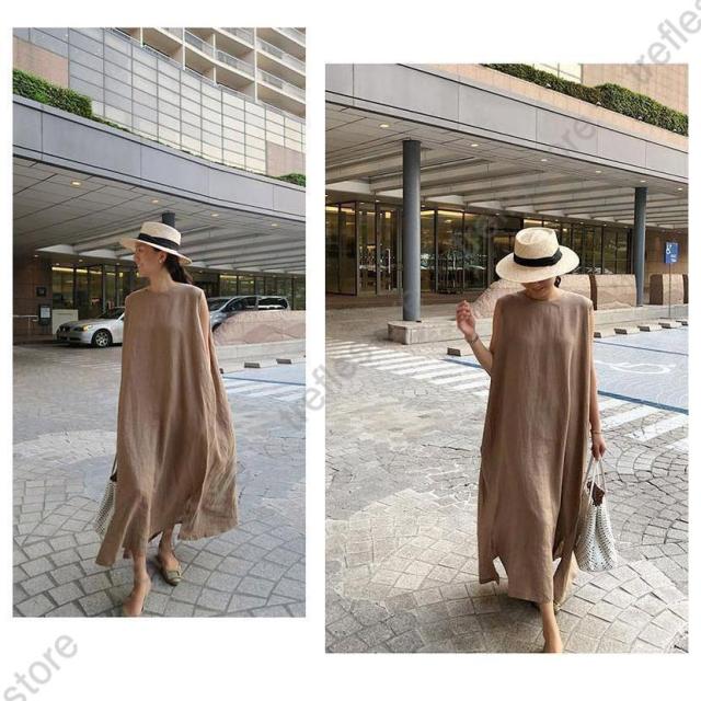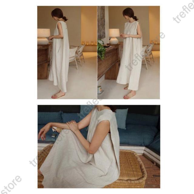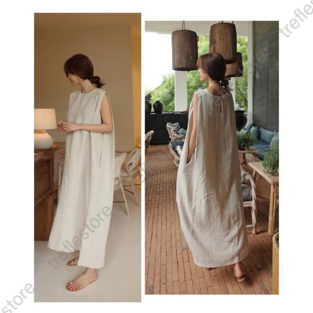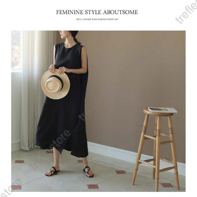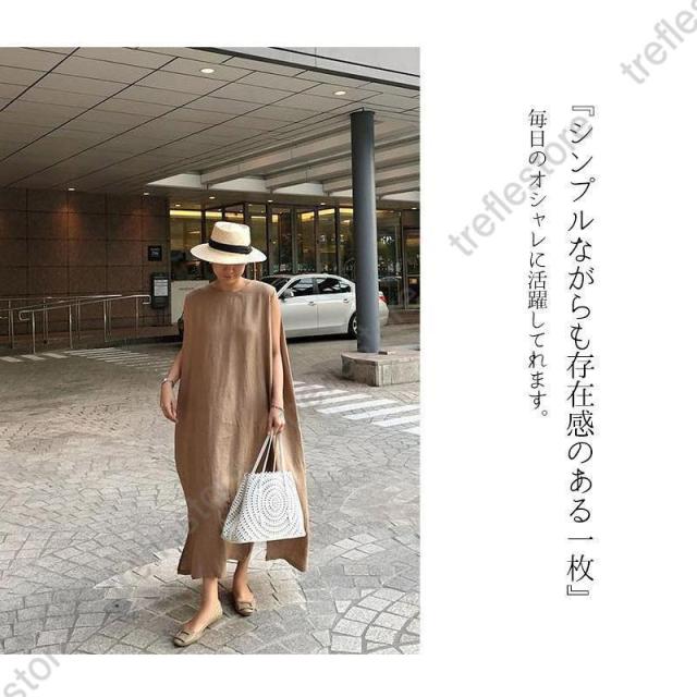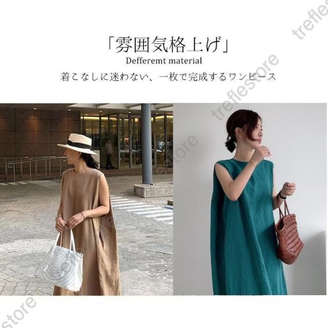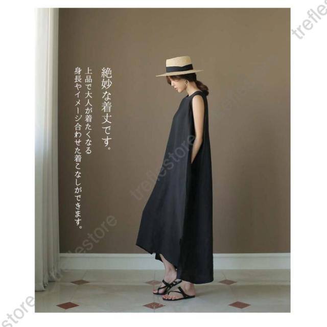 【ポイント5倍!】リネン ワンピース ノースリーブ マキシワンピース リネン 夏 綿麻 リネン混 無地 袖なし タンクトップ ミモレ丈 スリット 30代 40代 50代