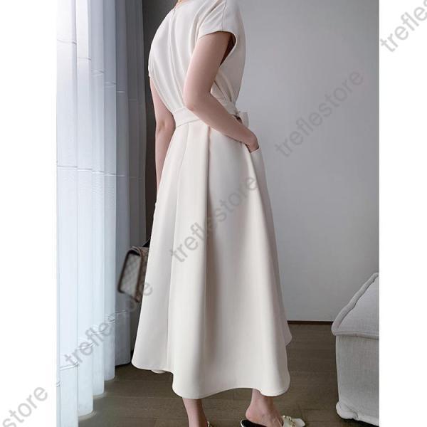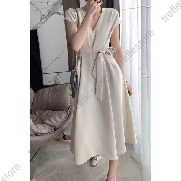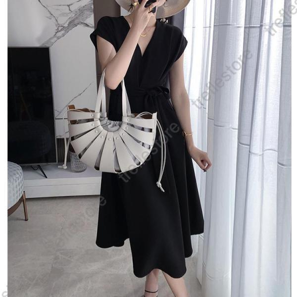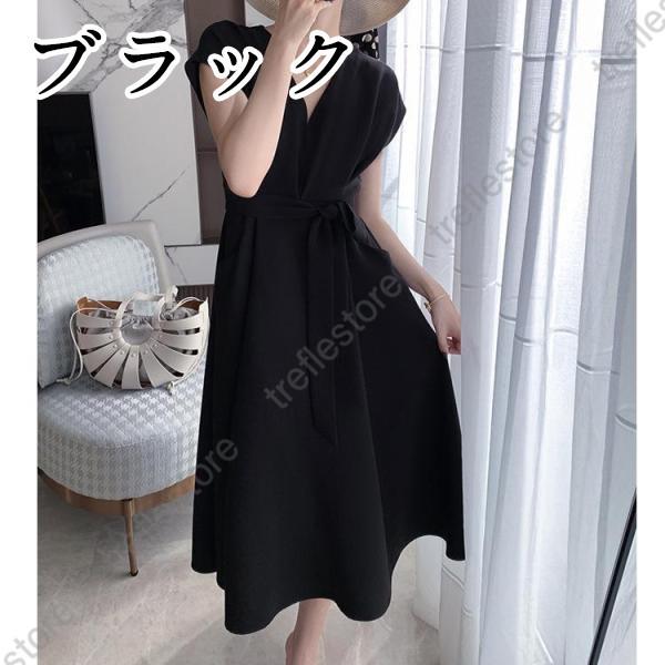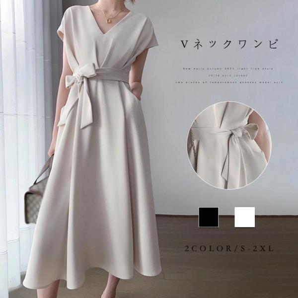 【ポイント5倍!】ワンピース レディース 40代 きれいめ マキシワンピース 春夏 半袖ワンピース 黒/白 Vネック リボン Aラインスカート オシャレ大人 ゆったり 通勤OL シンプル