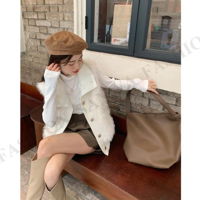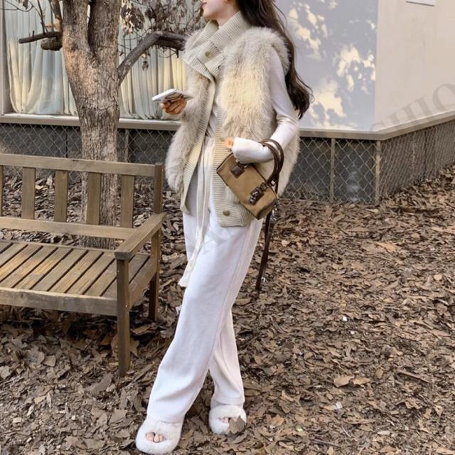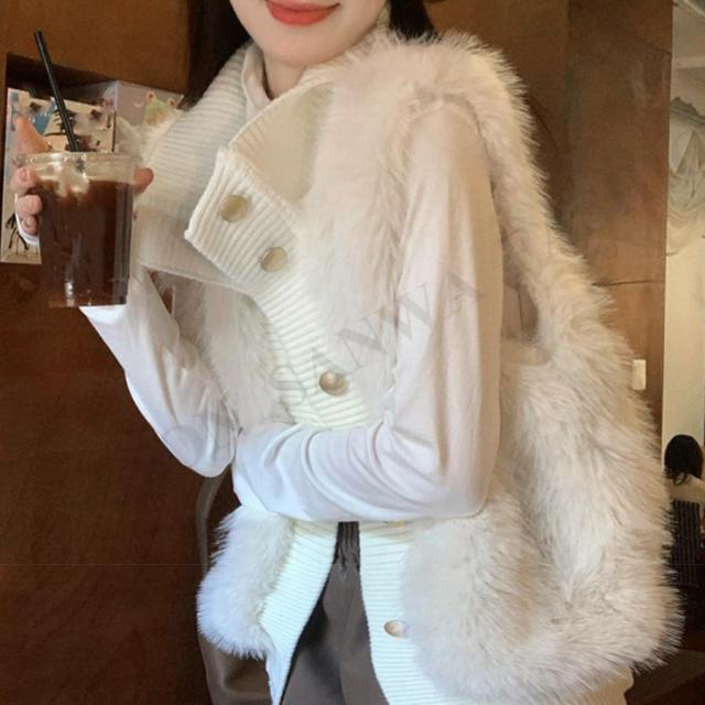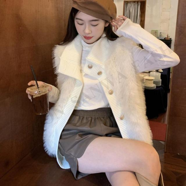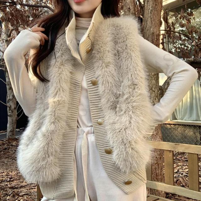 韓国 ファージレ きれいめ スタンドカラーファージャケット 袖なしファーカーディガン 秋冬 ニットアウター 羽織り着やせ