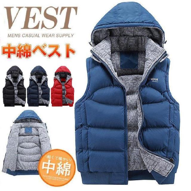 【ポイント5倍!】中綿ダウンベスト メンズ インナーベスト ブルゾン アウター あったか 防寒着 前開き トップス おしゃれ 定番 フード付き 冬服