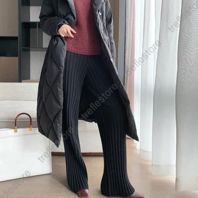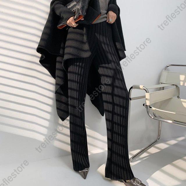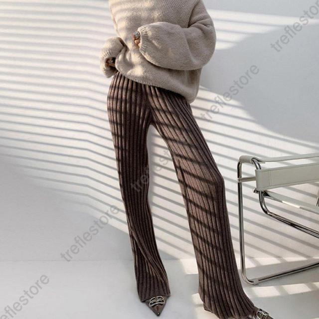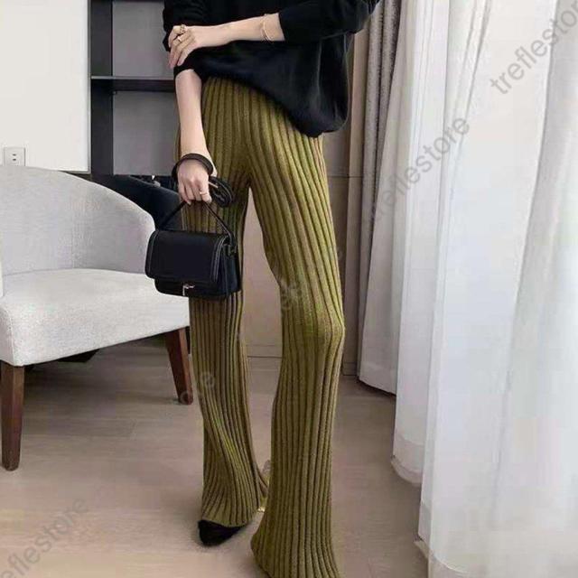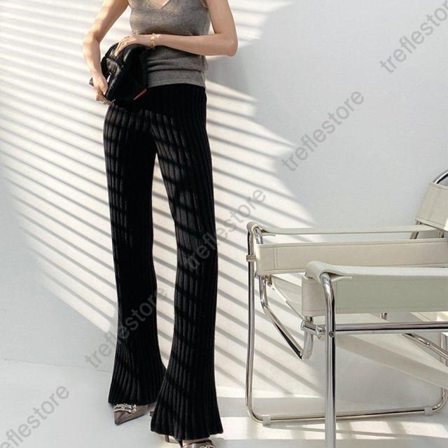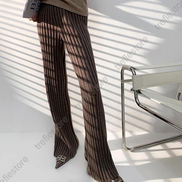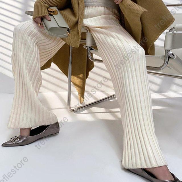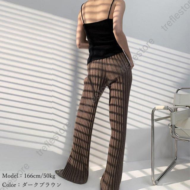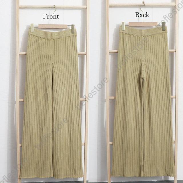 裾に向かって広がるフレアなシルエットがポイントのやや太めのリブニットパンツ