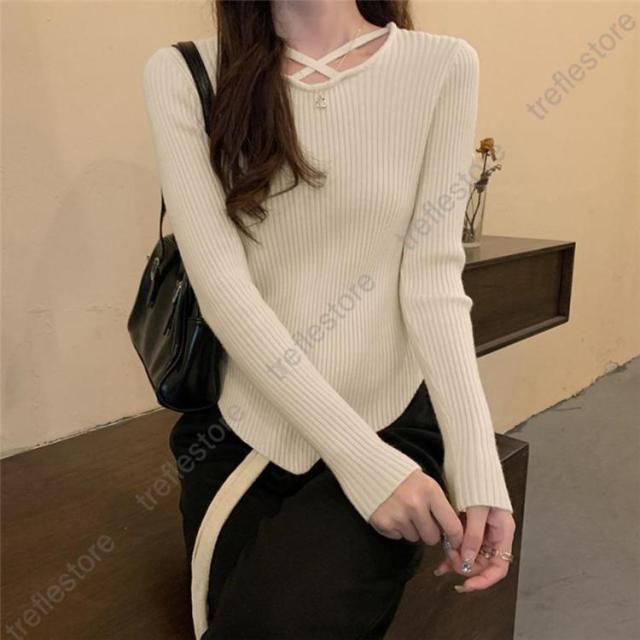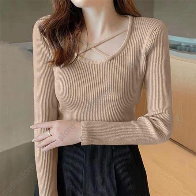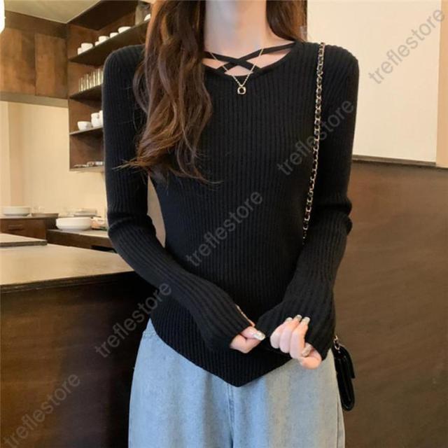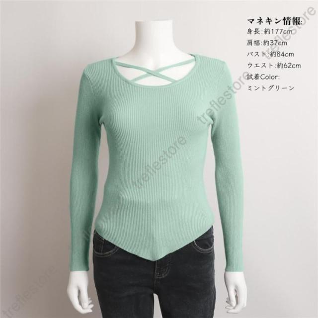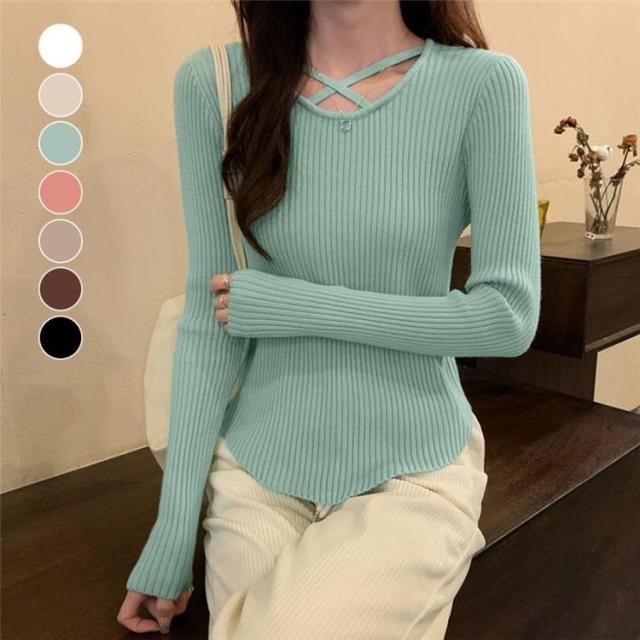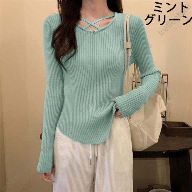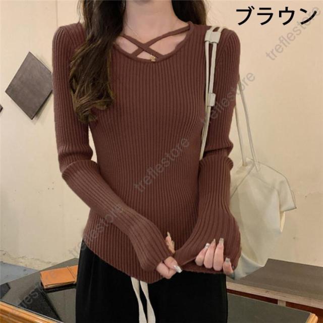 韓国風 リブニット セーター タイトトップス クロスデザイン 無地 シンプル 可愛い カジュアル 秋冬 7色
