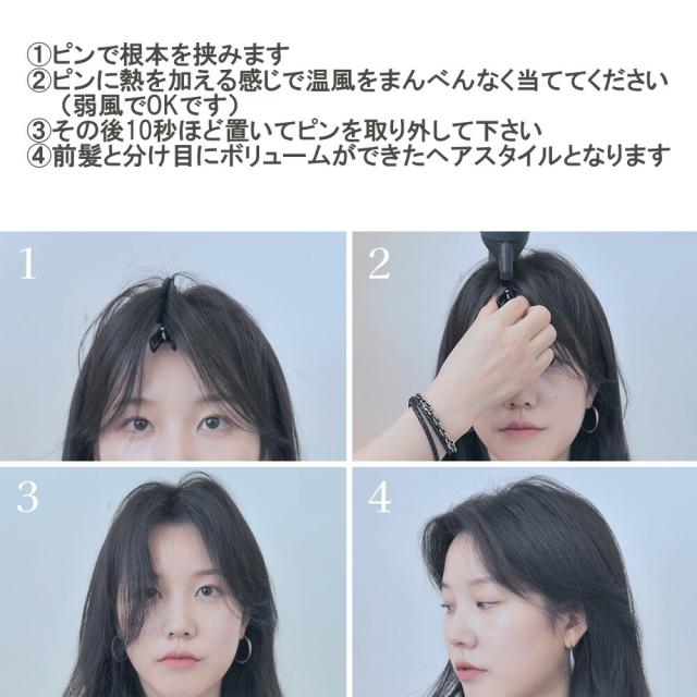 前髪の根元にピンを挟んでブローするだけで適度なふんわりボリュームに。