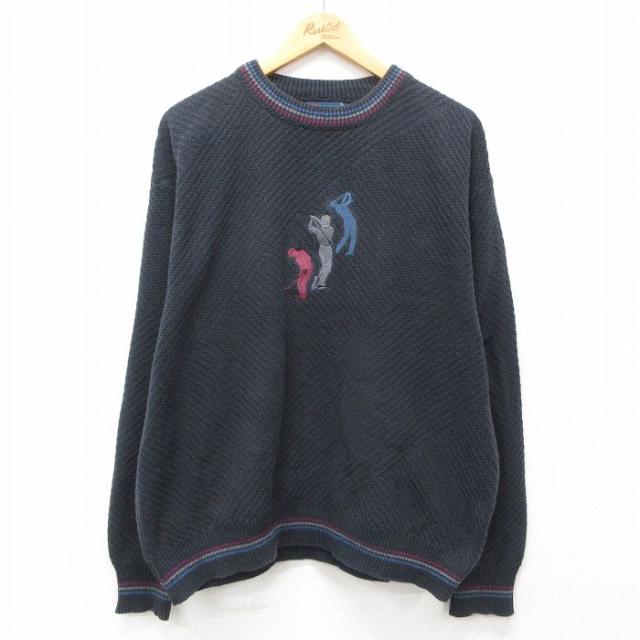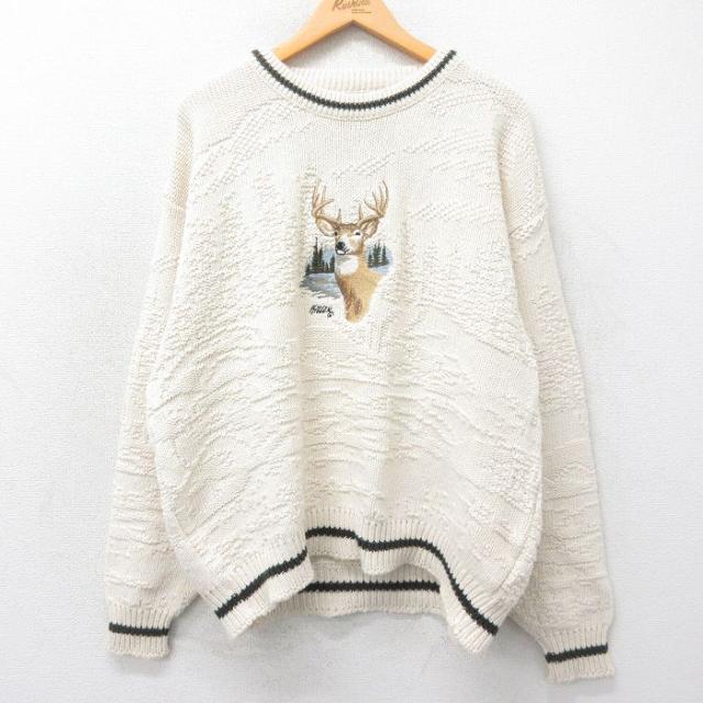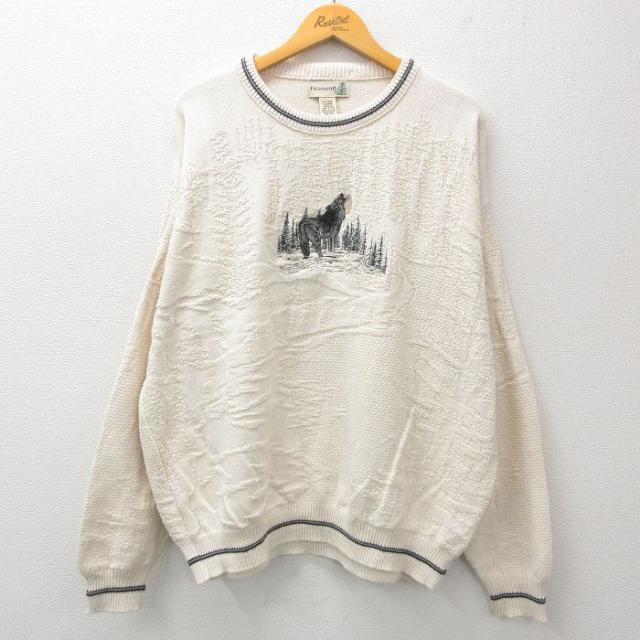 古着 長袖 セーター メンズ 90年代 90s オオカミ 刺繍 大きいサイズ コットン クルーネック USA製 生成り XLサイズ 中古 ニッ 中古 古着