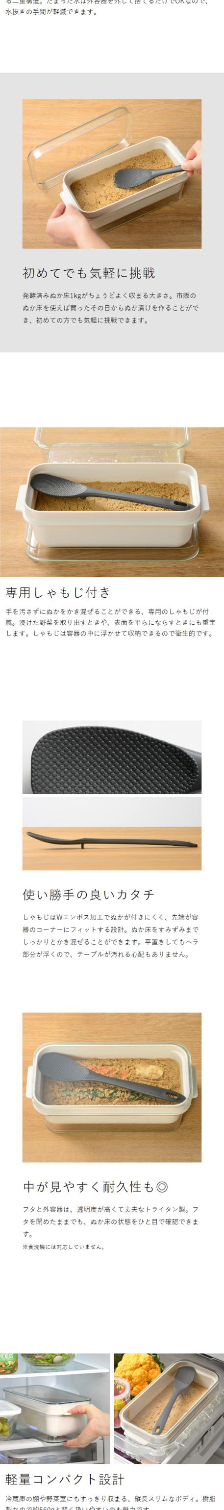 ぬかどこボックスは透明度が高く、丈夫でおしゃれな日本製。市販ぬか床1kgを入れるのにちょうどいいサイズで、二重構造のスリット穴から余分な水分を自然に排出。ヘラ付きで便利です。