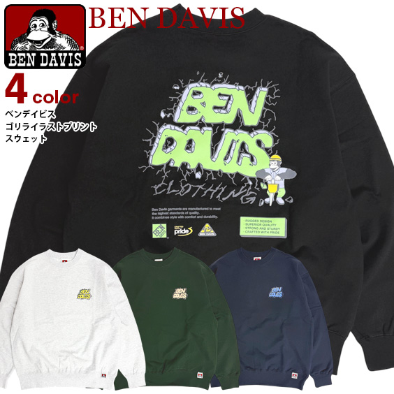 BEN DAVIS スウェット ベンデイビス ゴリラ ロゴ 発泡プリント トレーナー メンズ 裏毛 バックプリント ユニセックス BEN-2148