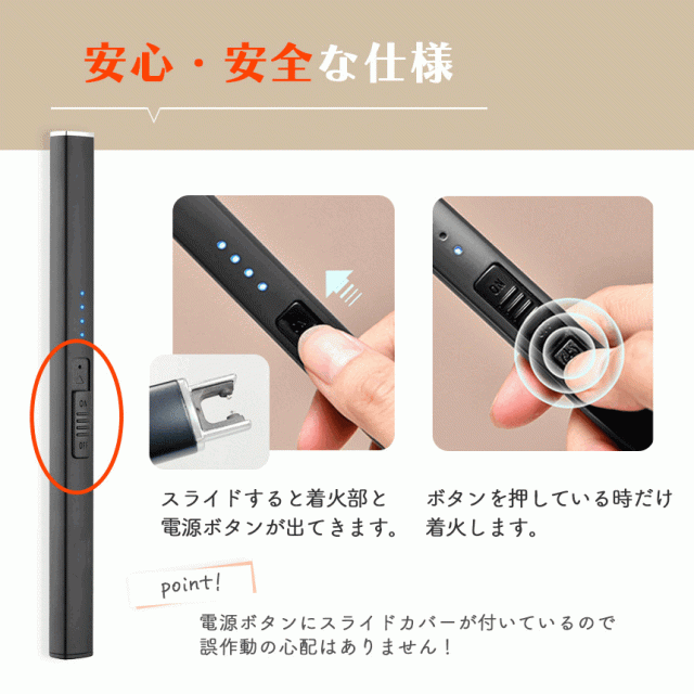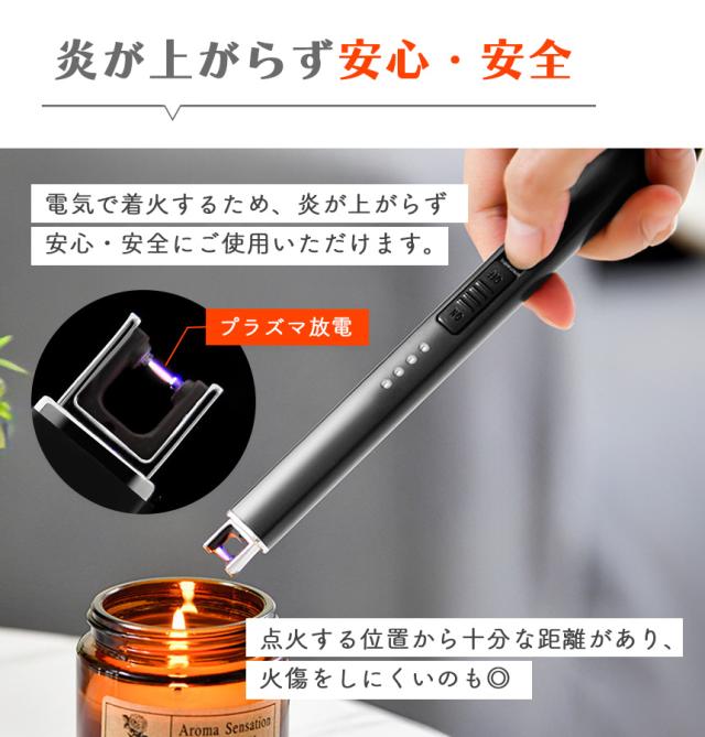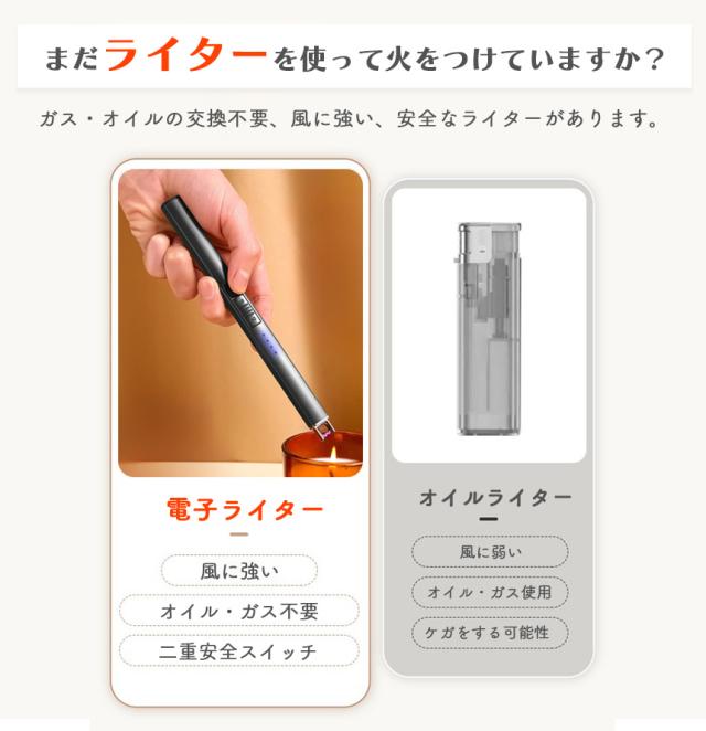 ●ガス・オイル交換不要! 電子ライター●まだライターを使って火をつけていますか?ガス・オイルの交換不要、風に強い、安全なライターがあります。point【炎が上がらず安心・安全】電気で着火するため、炎が上がらず、安心・安全にご使用いただけます。点火する位置から十分な距離があり、火傷をしにくいのも◎