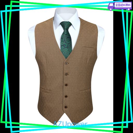 [HISDERN] スーツベスト ジレ ベスト メンズ Vネック ポケット付き 尾錠付き 光沢 スリム フィット フォーマル 紳士 礼服 結婚式チョッキ ビジネス (ブラウン/XS) V-01