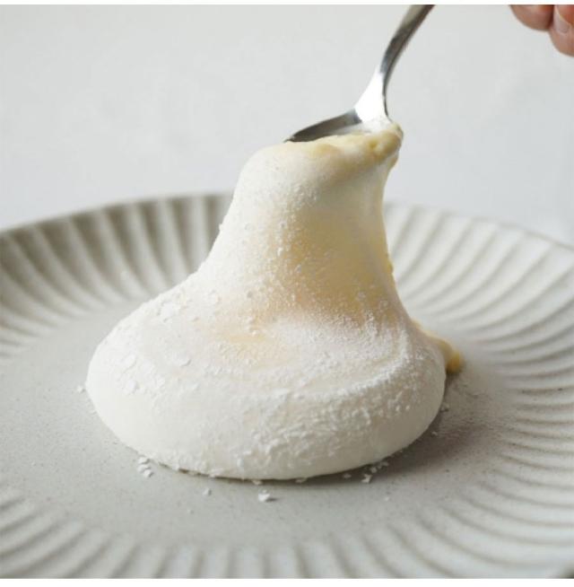 スプーンで食べるスタイルを提案。大福を!?と驚くが、手で持って食べることができないほど柔らかいとろける生地。中には、カスタードクリームや北海道産小豆を使用したつぶあん、あまおう苺クリーム、国産抹茶を使ったクリームが包み込まれとろけるハーモニーがたまらない。