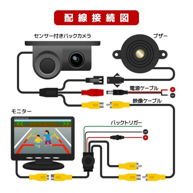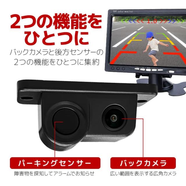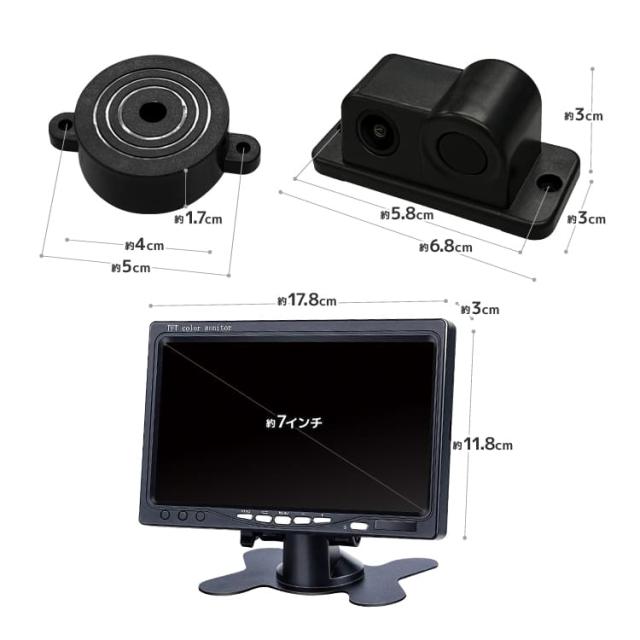 後方パーキングセンサーの機能がついたバックカメラ+後方アラーム+7インチバックモニターのセットです。