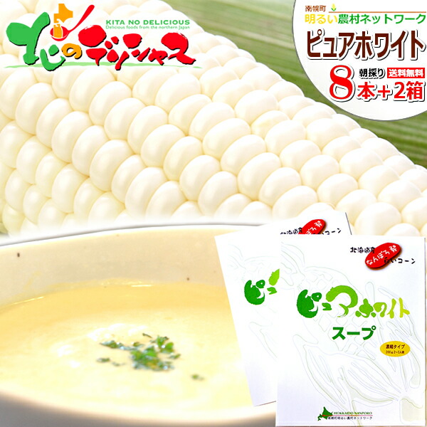 【予約】 北海道産 南幌町 とうもろこしスープセット (ピュアホワイトSP 8本+スープ 2箱/冷蔵)南幌町明るい農村ネットワーク 朝採り トウモロコシ スイートコーン 残暑見舞い ギフト 贈り物 プレゼント 北海道 グルメ 産地直送 お取り寄せ