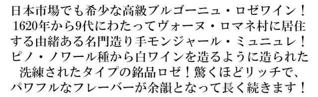 日本市場でも希少な高級ブルゴーニュ・ロゼワイン! 1620年から9代にわたってヴォーヌ・ロマネ村に居住 する由緒ある名門造り手モンジャール・ミュニュレ! ピノ・ノワール種から白ワインを造るように造られた 洗練されたタイプの銘品ロゼ!驚くほどリッチで、 パワフルなフレーバーが余韻となって長く続きます!