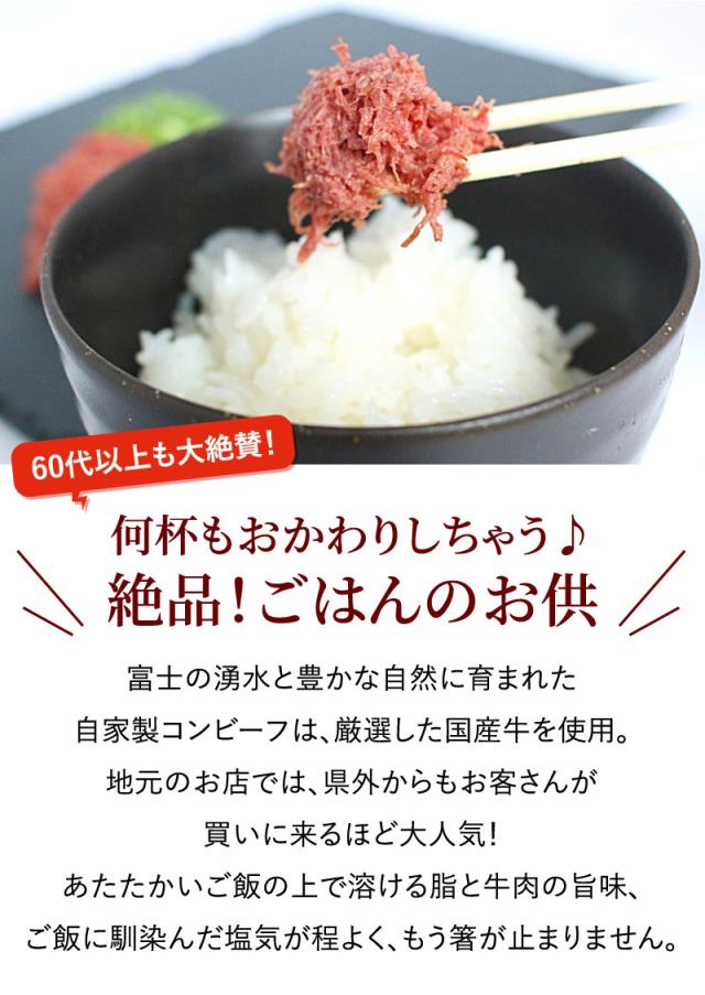 富士の湧水と豊かな自然に育まれた自家製コンビーフは、厳選した国産牛を使用。地元のお店では、県外からもお客さんが買いに来るほど大人気!あたたかいご飯の上で溶ける脂と牛肉の旨味、ご飯に馴染んだ塩気が程よく、もう箸が止まりません。