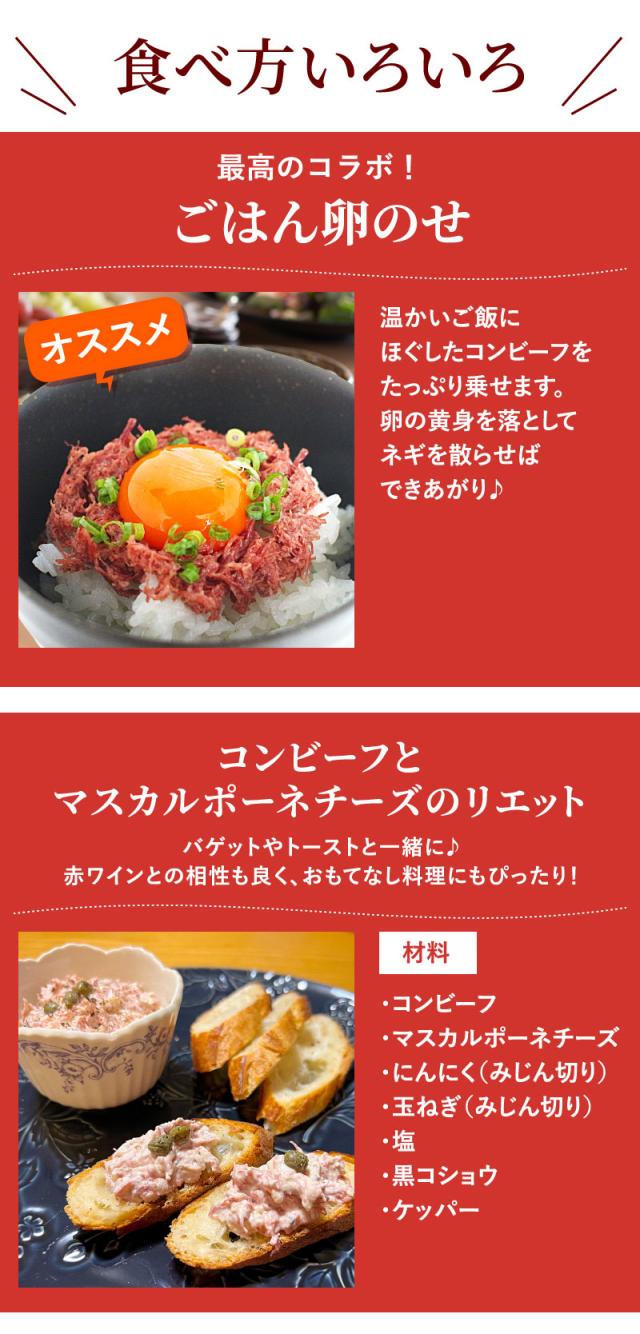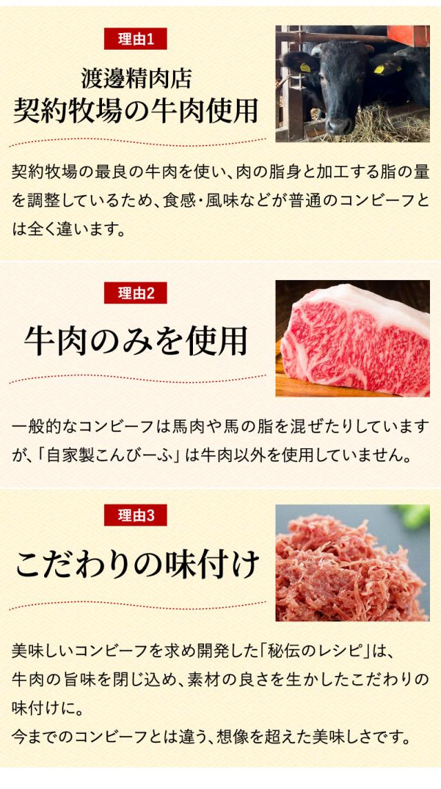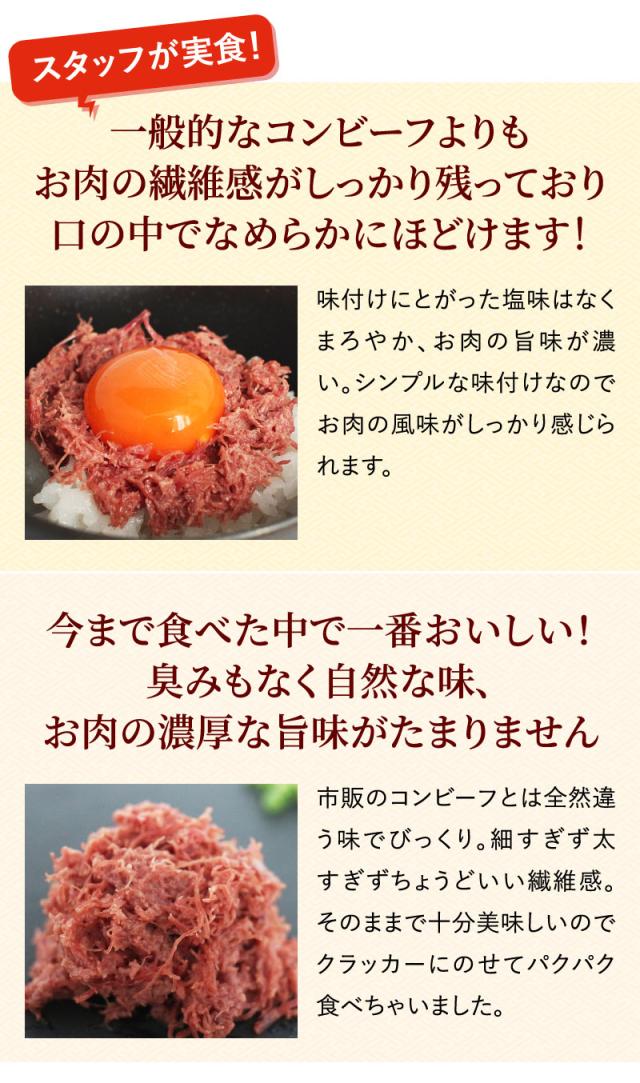 契約牧場の最良の牛肉を使い、肉の脂身と加工する脂の量を調整しているため、食感・風味などが普通のコンビーフとは全く違います。