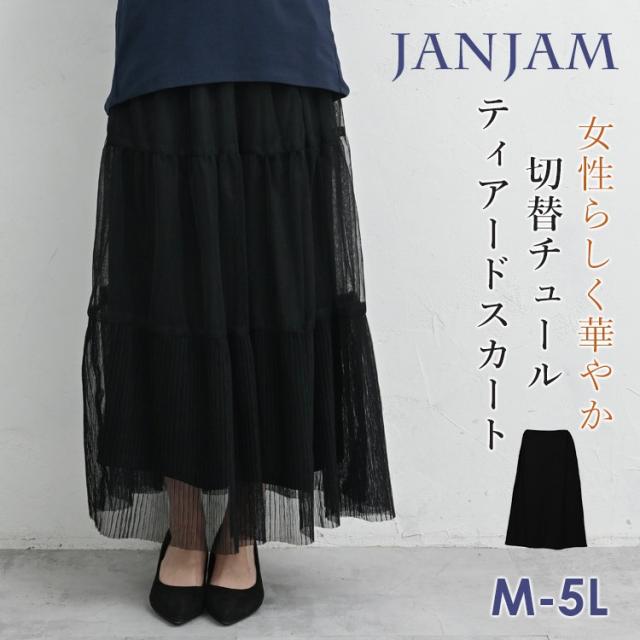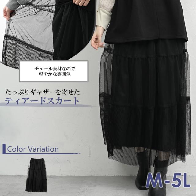 大きいサイズ レディース チュール切替ティアードスカート ロング丈 ウエストゴム Aライン ボトムス M/LL/3L/4L/5L ゆったりサイズ ぽっちゃり女子 プラスサイズ
