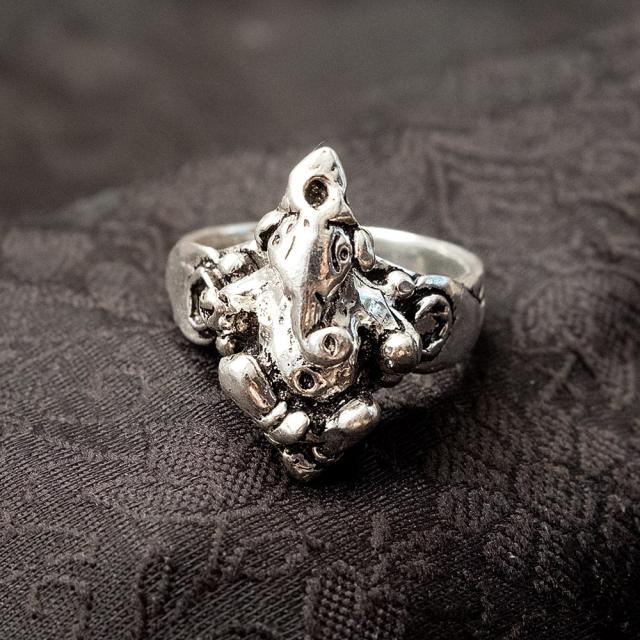 幸運と金運の神様、ガネーシャをモチーフにしたリングです。リアルなガネーシャがこの世界が始まった時に鳴ったとされる神聖なオーンと並んでデザインされています。■学問・金運の神様 ガネーシャ
