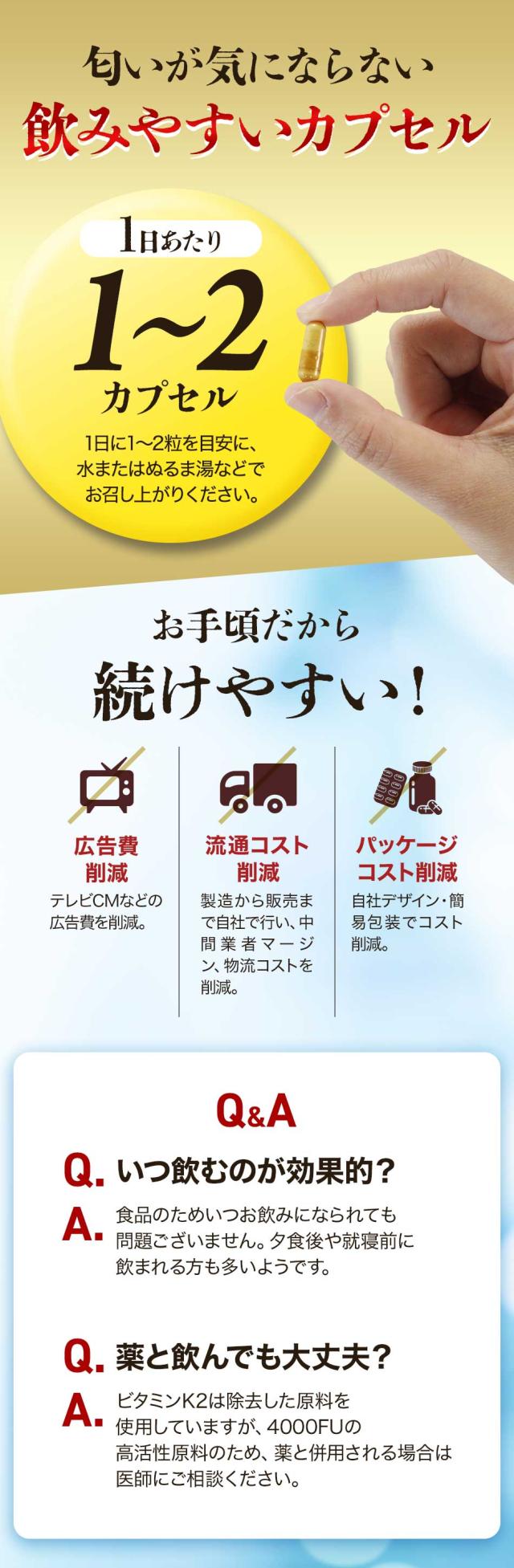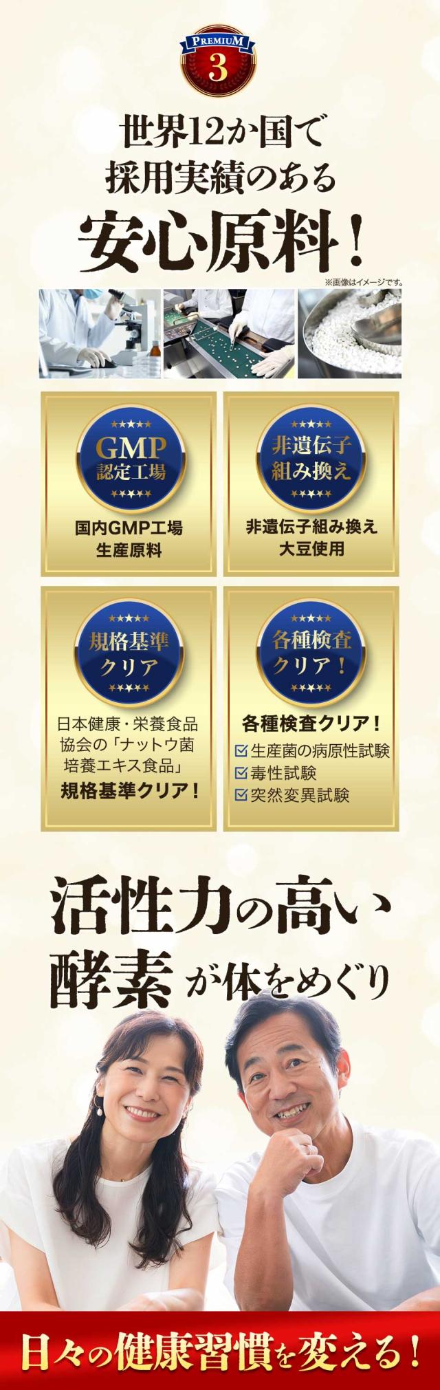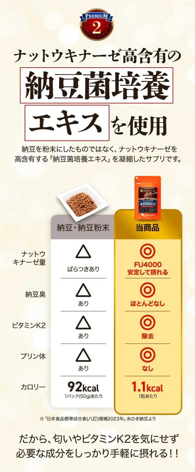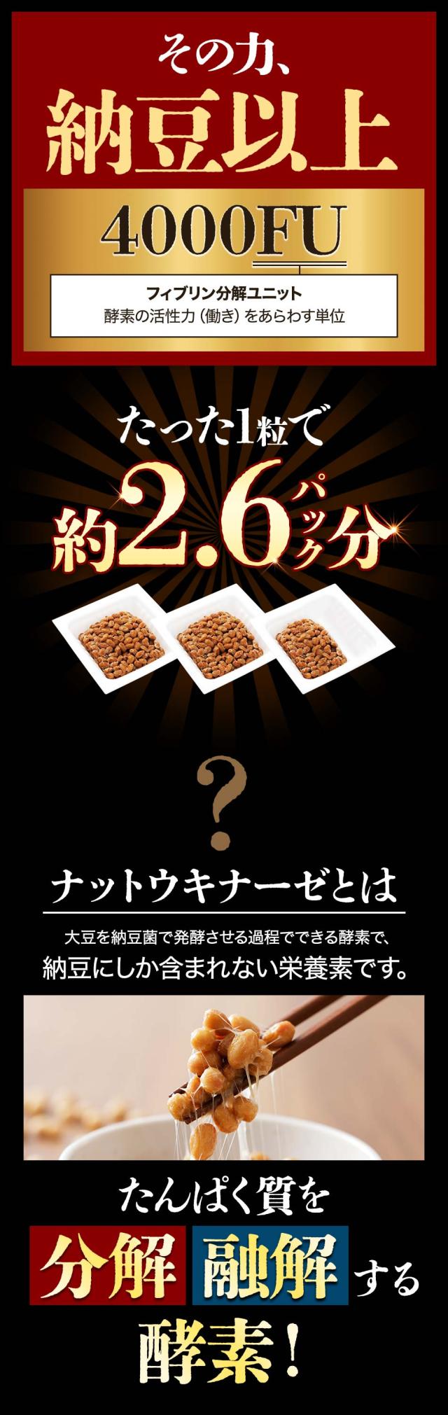 主要原料(1粒あたり):納豆菌培養エキス末(納豆菌培養エキス、デキストリン)(国内製造)100mg