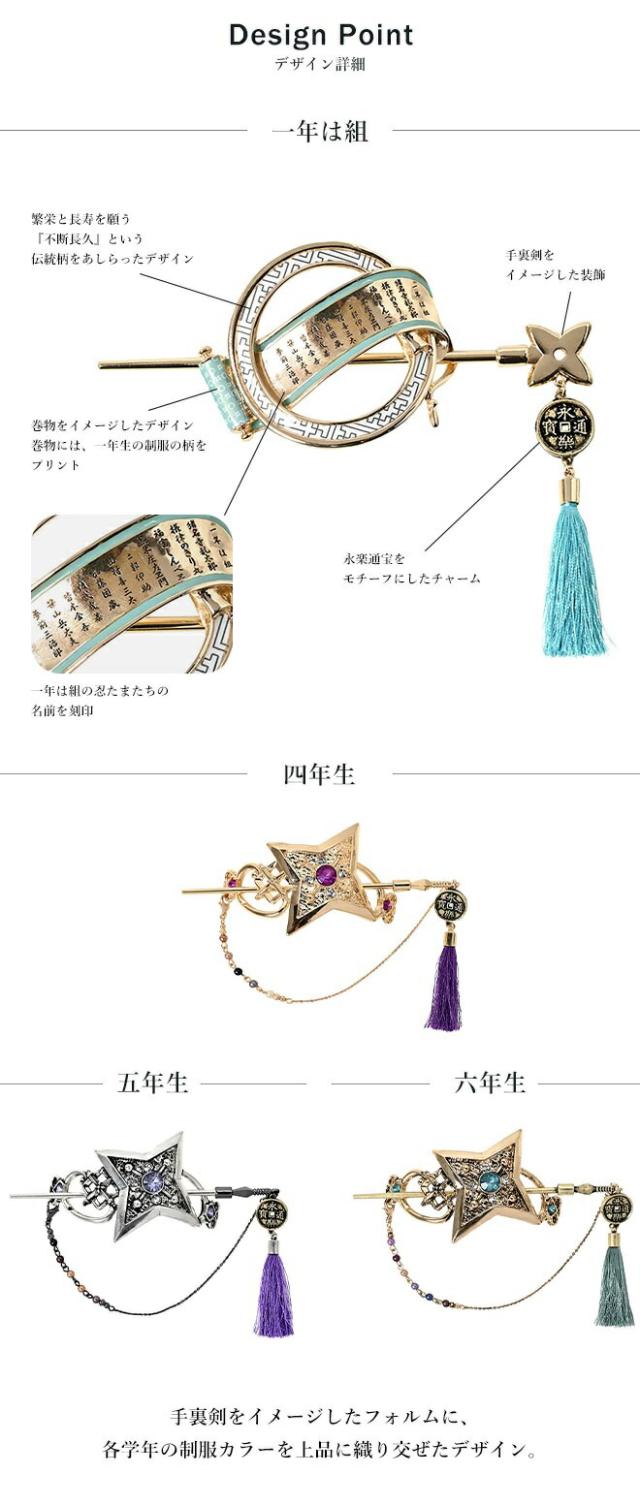 手裏剣をイメージしたフォルムに、各学年の制服カラーを上品に織り交ぜたデザイン。