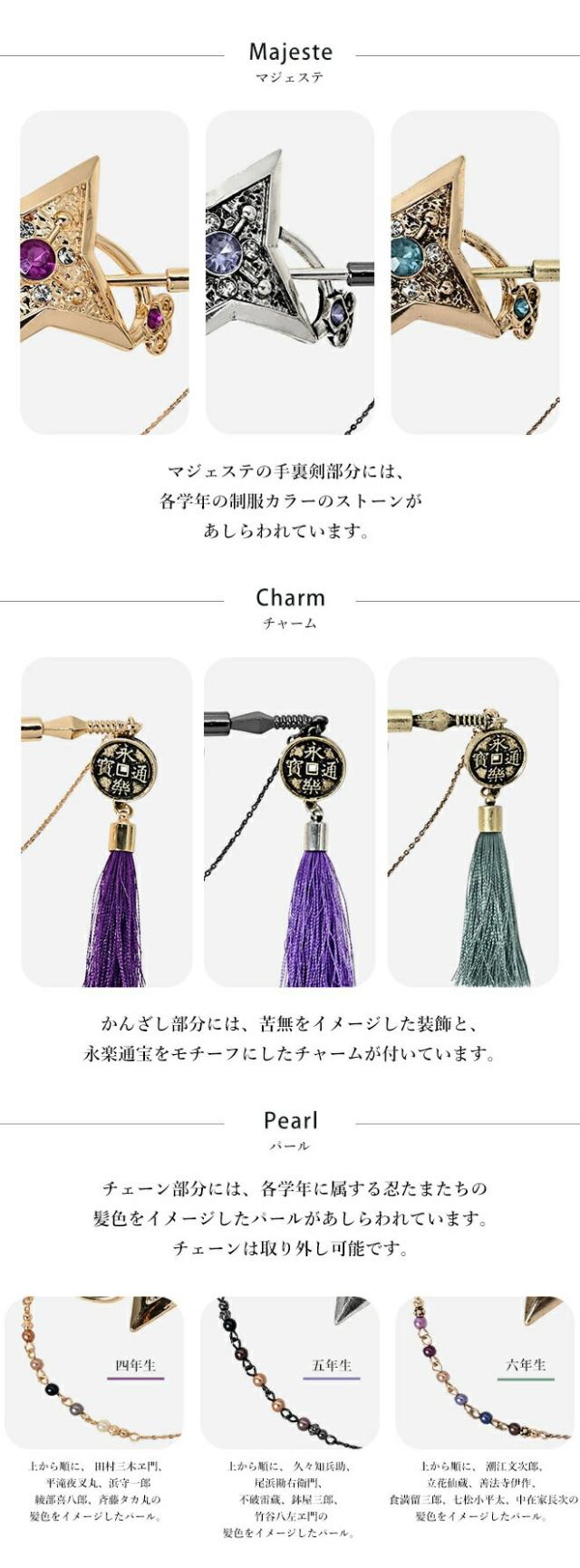 チェーン部分には、各学年に属する忍たまたちの髪色をイメージしたパールがあしらわれています。