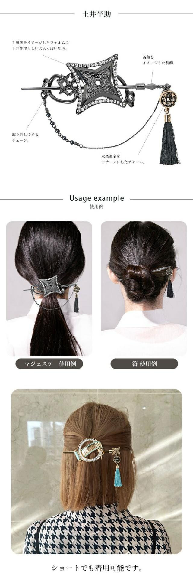 かんざし部分には、苦無をイメージした装飾と、永楽通宝をモチーフにしたチャームが付いています。