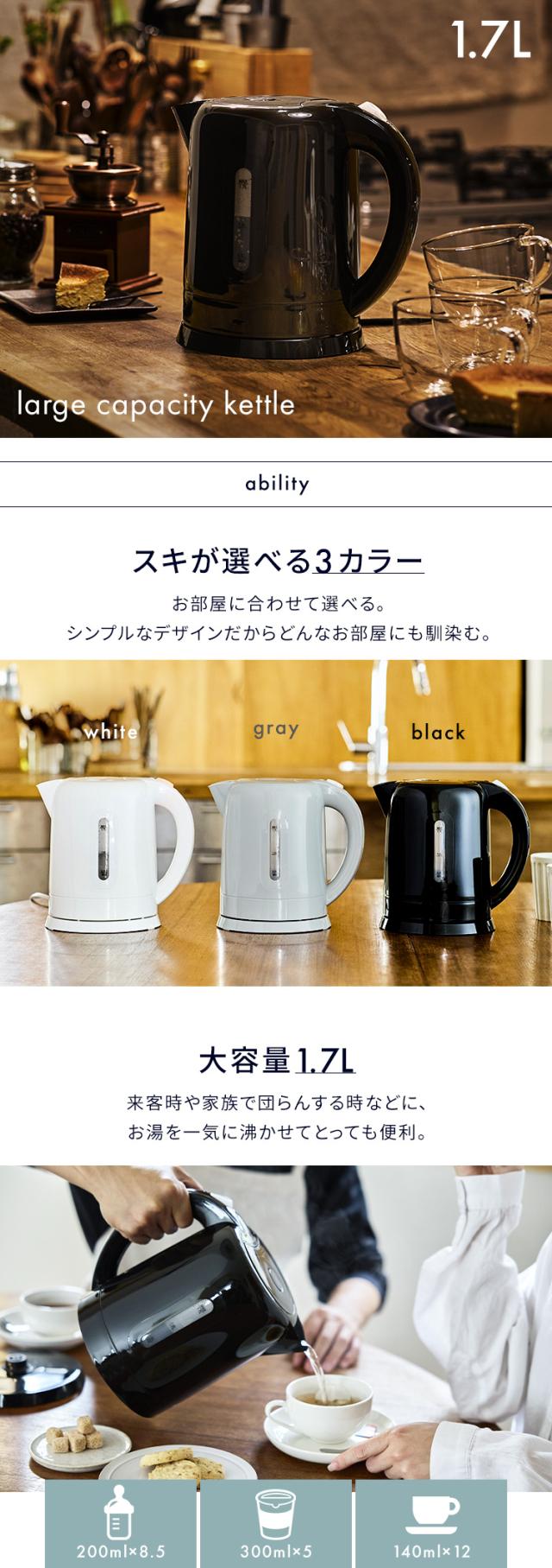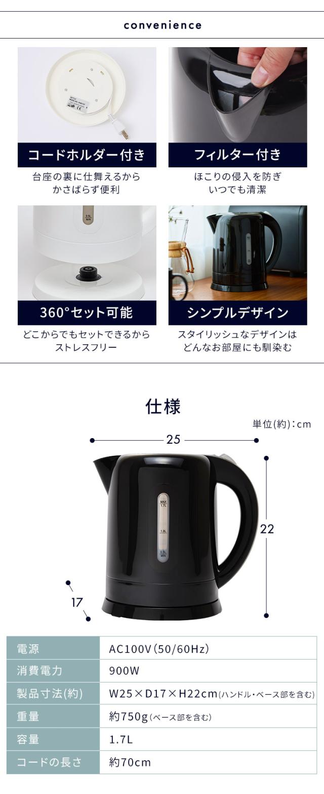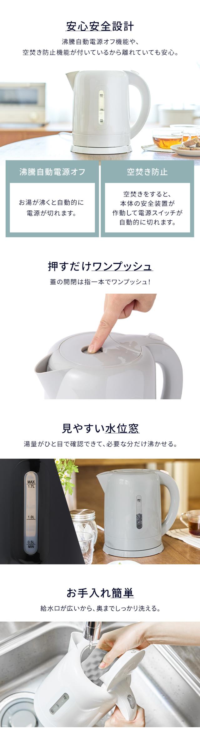 ケトル 電気ケトル 大容量 1.7L お手入れ簡単 1.7l おしゃれ 一人暮らし KTK-017 1700ml 大容量ケトル 電気 けとる 北欧 かわいい 新生活 自動スイッチOFF 空焚き防止 インテリア ブラック ホワイト グレー プレゼント ギフト