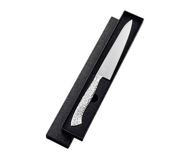 [ハンドル] 気品のある槌目模様、深みのある銀の色調 変則的な打痕が美しい陰影を生み出す印象的なデザインです。槌目の上に滑りにくい加工を施し、手に吸い付くような感覚と握りやすさを実現。さらに中を空洞にしたモナカ柄にすることで軽さも両立しました。