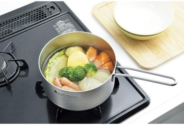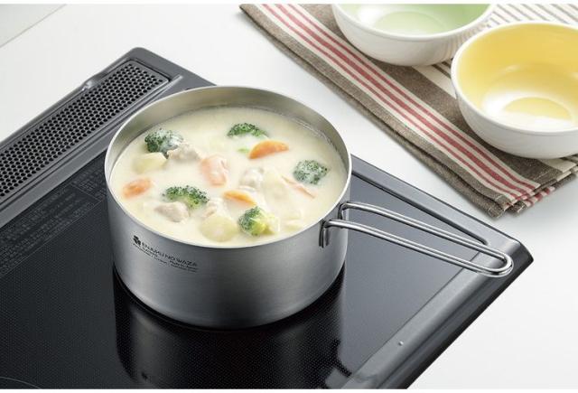 熱の伝わりの良いアルミ芯三層構造。ステンレスハンドルで食洗器、オーブン調理、焚火、炙り火にも対応。