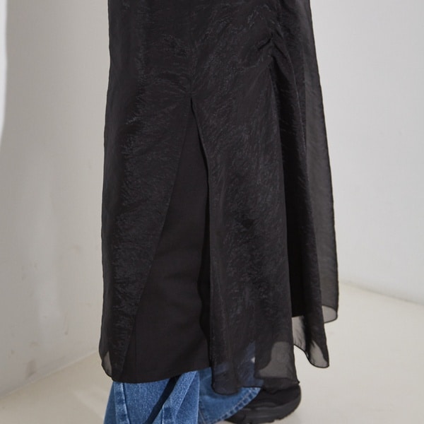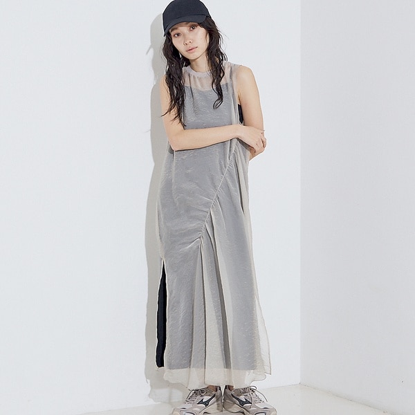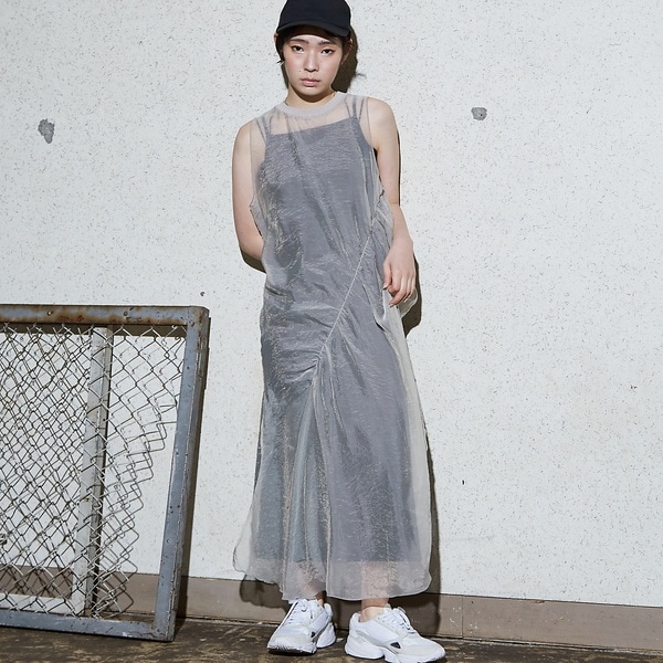シアーな透け感が魅力のレイヤードデザインの2枚セットのワンピース。