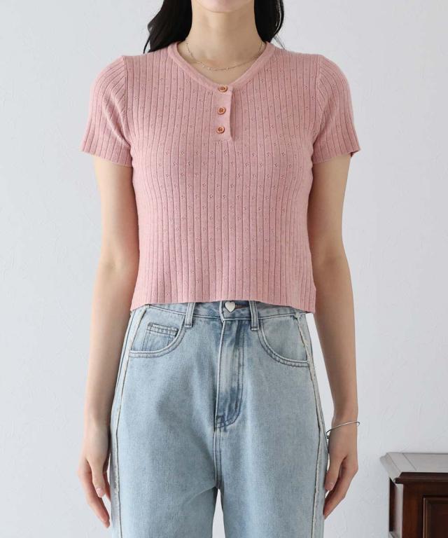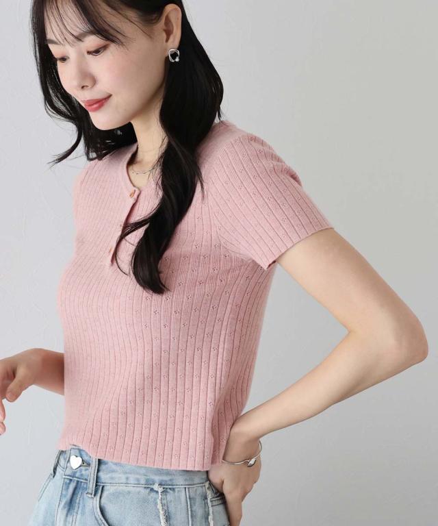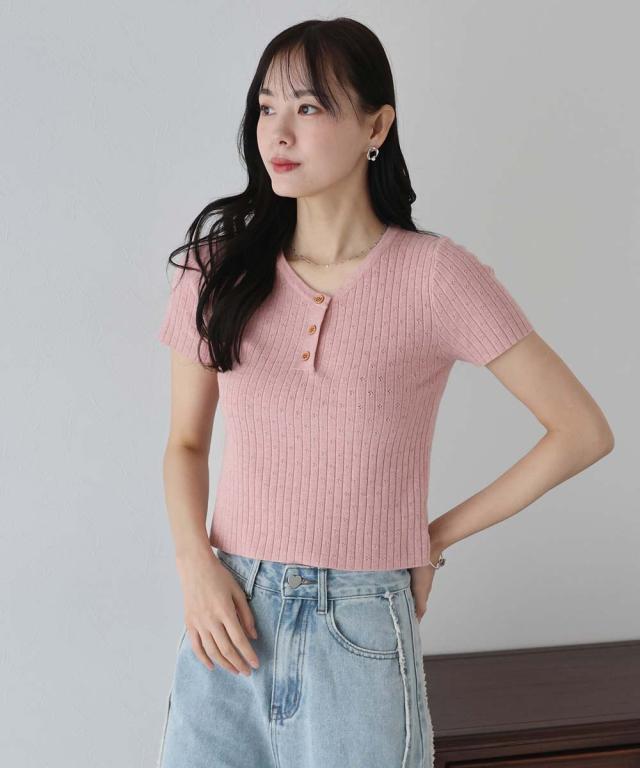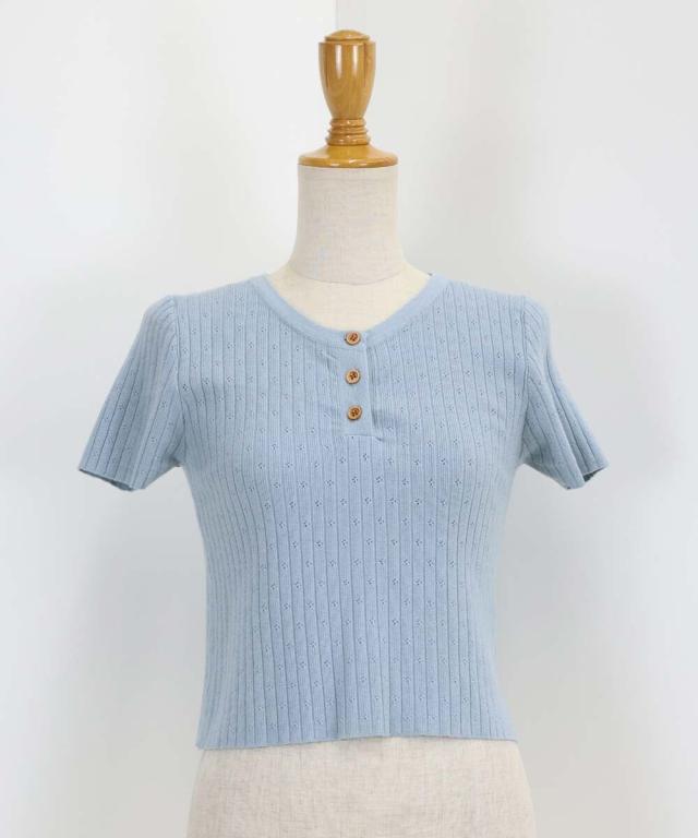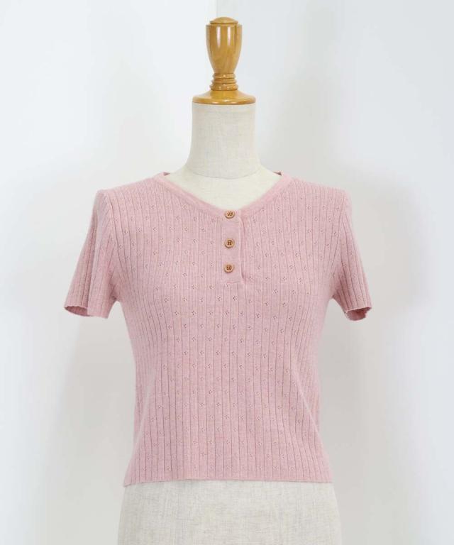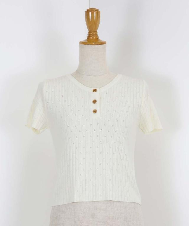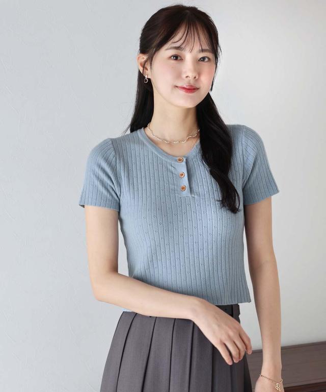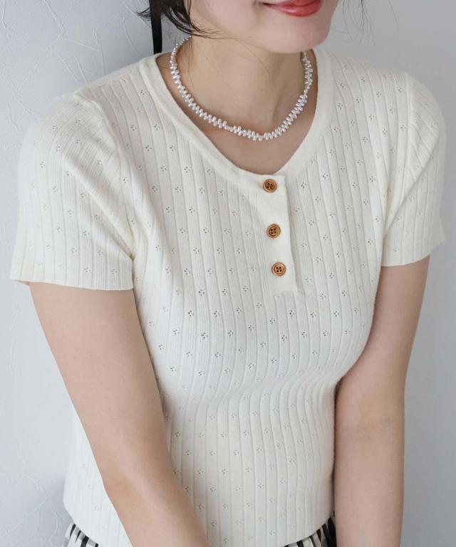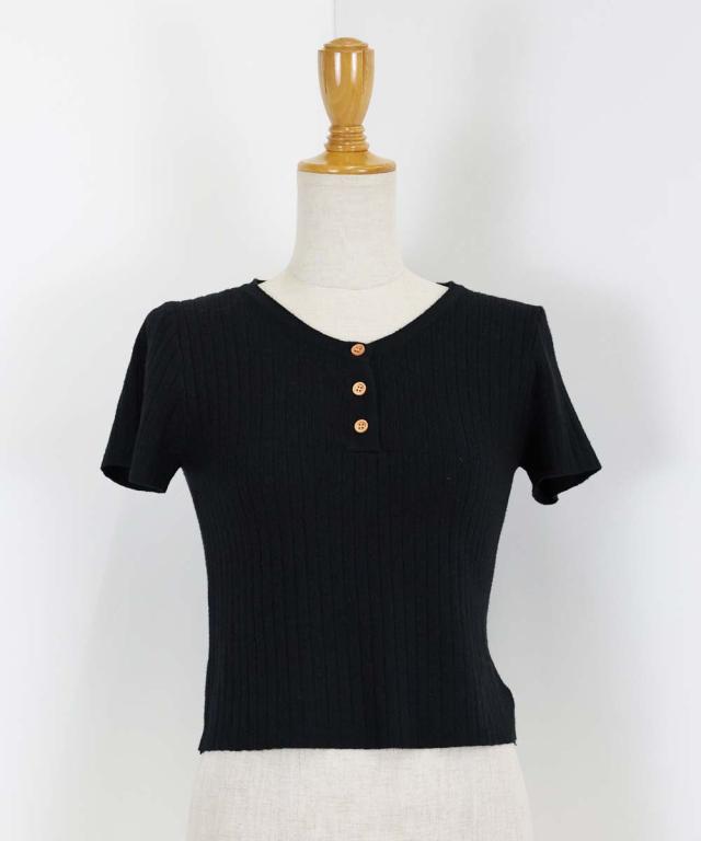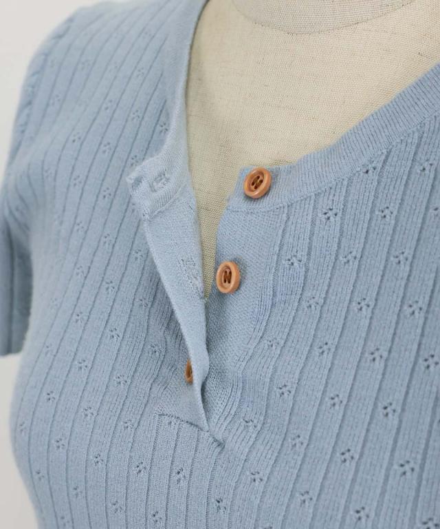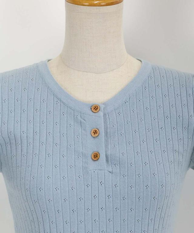 首元の木目調のボタンがカジュアルなポイントになり、キーネックデザインで首周りをすっきりと見せます。