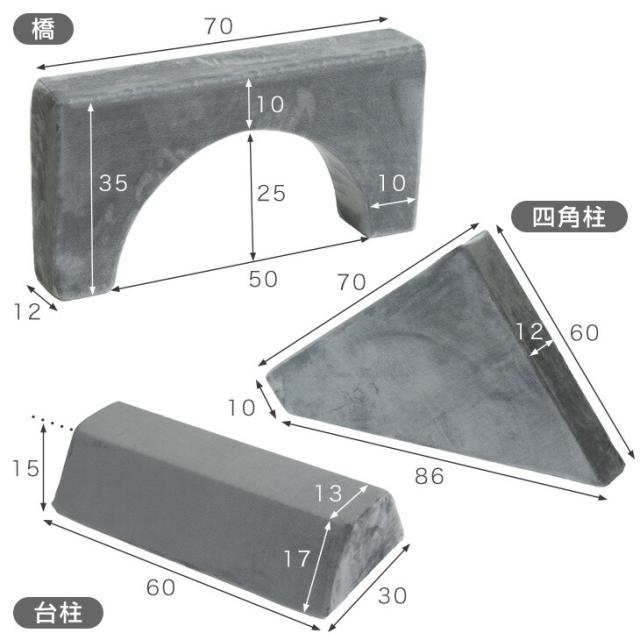 円柱x4、半円柱x2、橋x2、直方体(長)x2、台柱x2、直方体(大)x2、四角柱x2