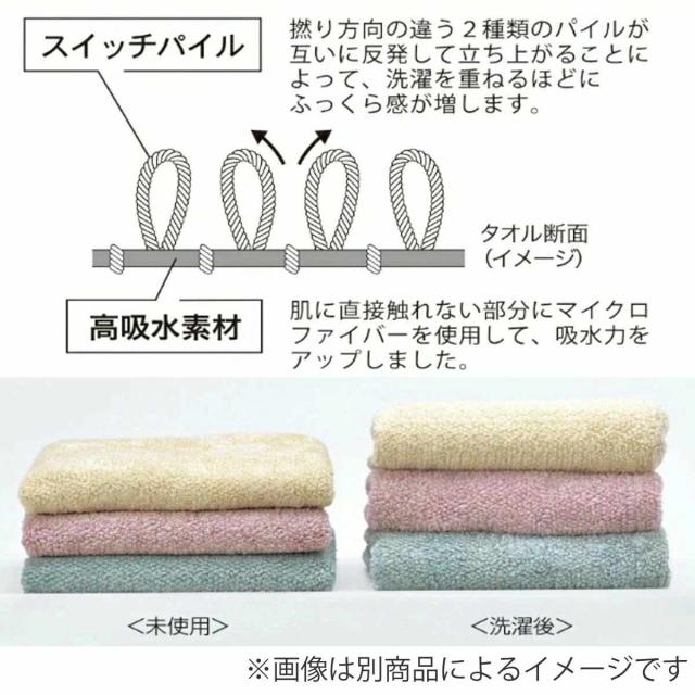 スイッチパイルは、洗ってもパイルがへたりにくく、膨らみのある風合いを持続させる製造技術です。一般のタオルの3倍の吸収力があります。