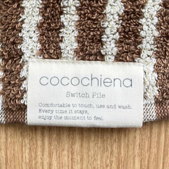 タオルのカラーに馴染む「cocochiena」のおしゃれなタグが付いています。