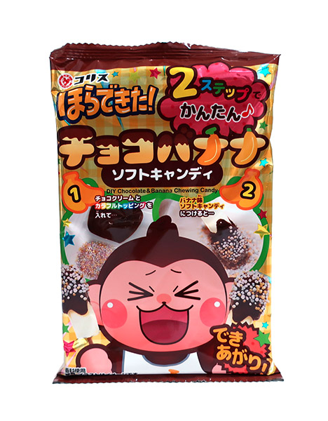 バナナ味のソフトキャンディにチョコクリームとカラフルトッピングをつけて食べるお菓子です。
