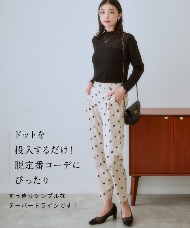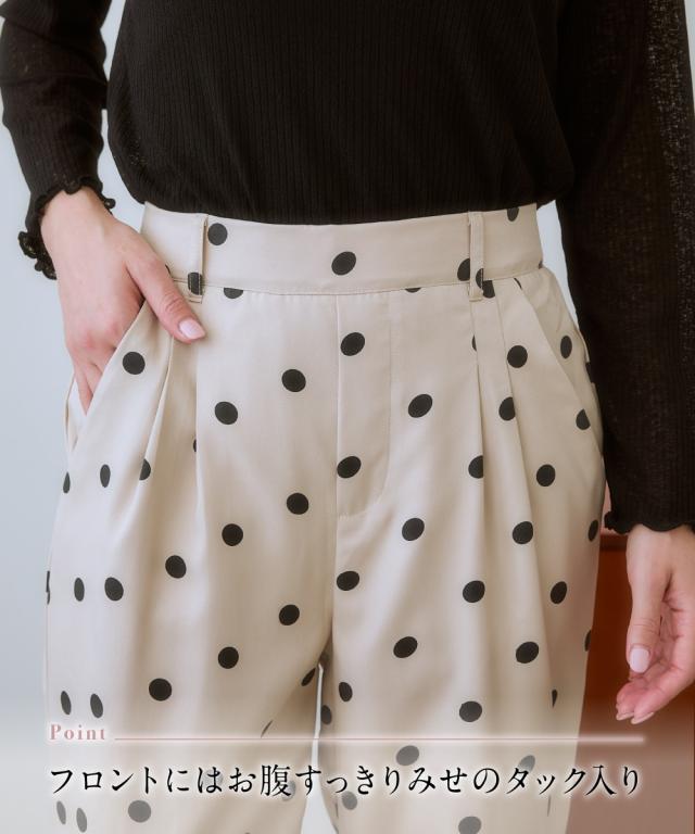「可愛い」を詰め込んだ、レトロなムード漂うテーパードパンツ。■デザイン 大きめドット柄が目を惹く、存在感抜群のアイテムです。 ゆったりとしたシルエットで、リラックス感も満点 ウエストは後ゴム仕様で、楽ちんな履き心地 両脇のポケットは標準装備です!■素材 適度な落ち感があるポリエステルを使用。 洗濯機OKでお手入れも簡単がうれしいですね。■おすすめのスタイリング 着回し力抜群で、デイリーユースにぴったり! お洋服に合わせやすいベーシックカラーなので、着回し力も抜群です。 普段使いはもちろん、デートや女子会にもおすすめです。