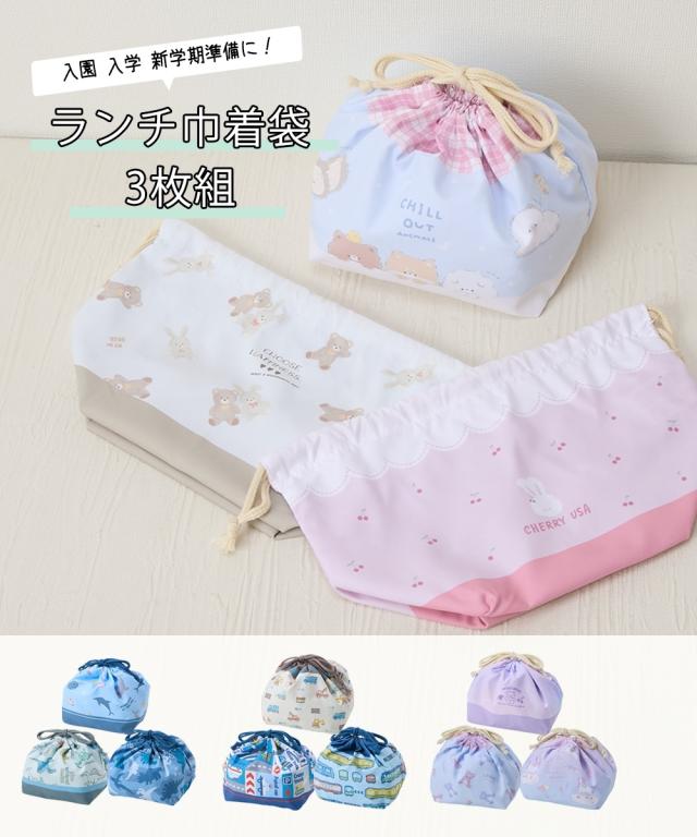 マチ付きランチ巾着3枚組(男の子 女の子 入園 入学 新学期準備)