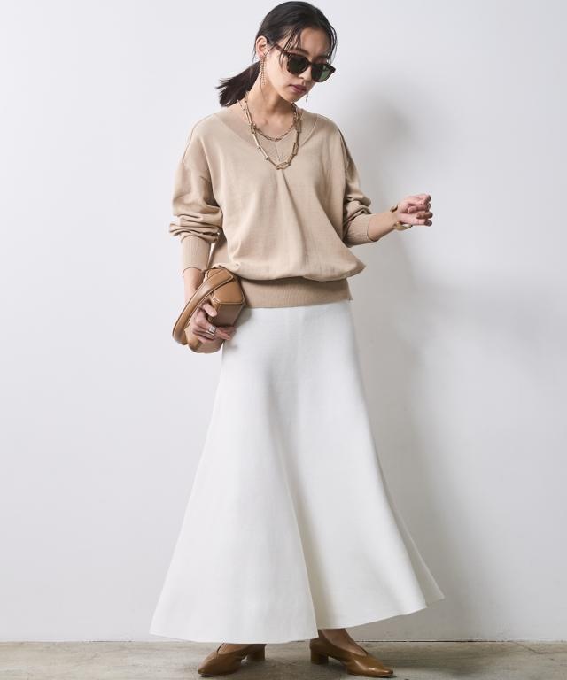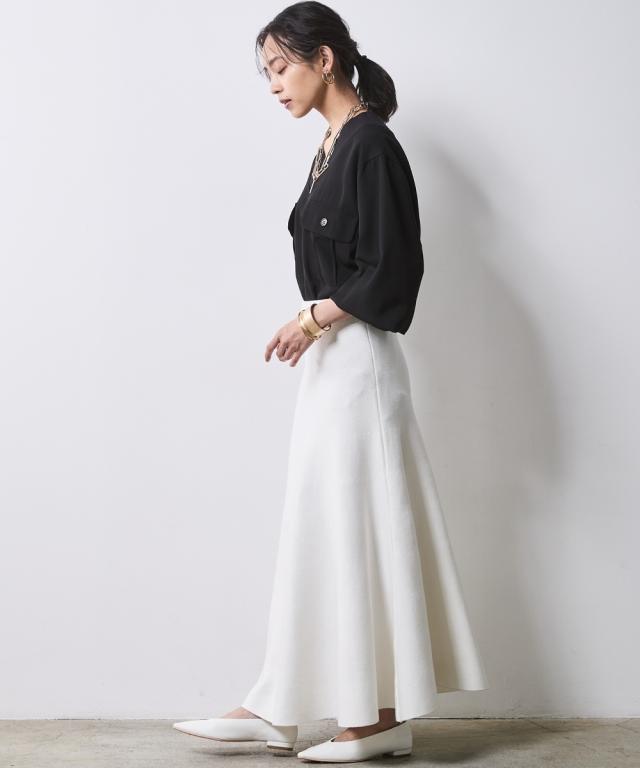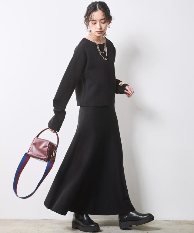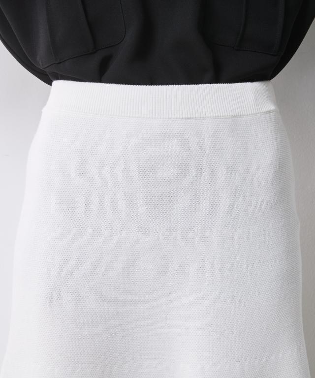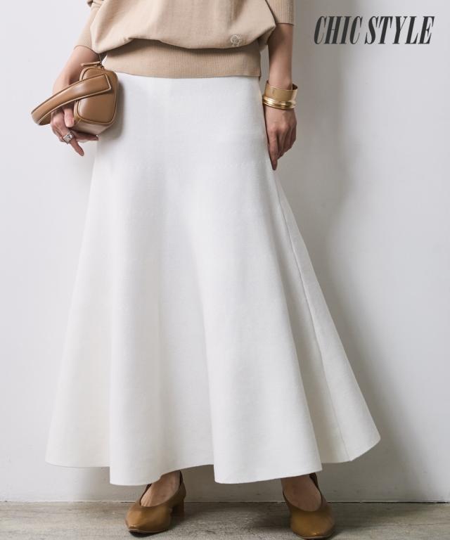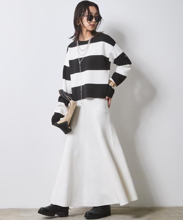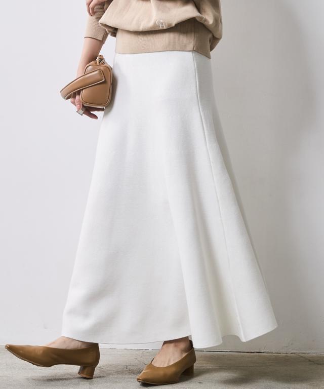 いろんなシーンで活躍するキレイ見えニットフレアスカート。■デザイン 目の詰まったやや肉厚なハイゲージできれいめ見えする一枚。 ウエストからヒップはピッタリ、裾に向かって広がるきれいな細見えシルエット。 スッキリ見えするウエストのゴム仕様もポイント。■素材 綿アクリルの糸を使用した度目のつまったミラノリブ編を使用。■おすすめのスタイリング キレイ目のブラウスや、カジュアルなデニムシャツ等、合わせるアイテム次第で、きれいめにもカジュアルにも決まるニットスカートです。 別売り同素材のニットトップスを合わせるとボーダー+無地、無地+無地のセットアップになります。