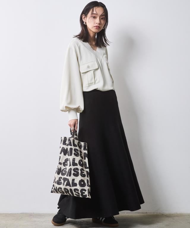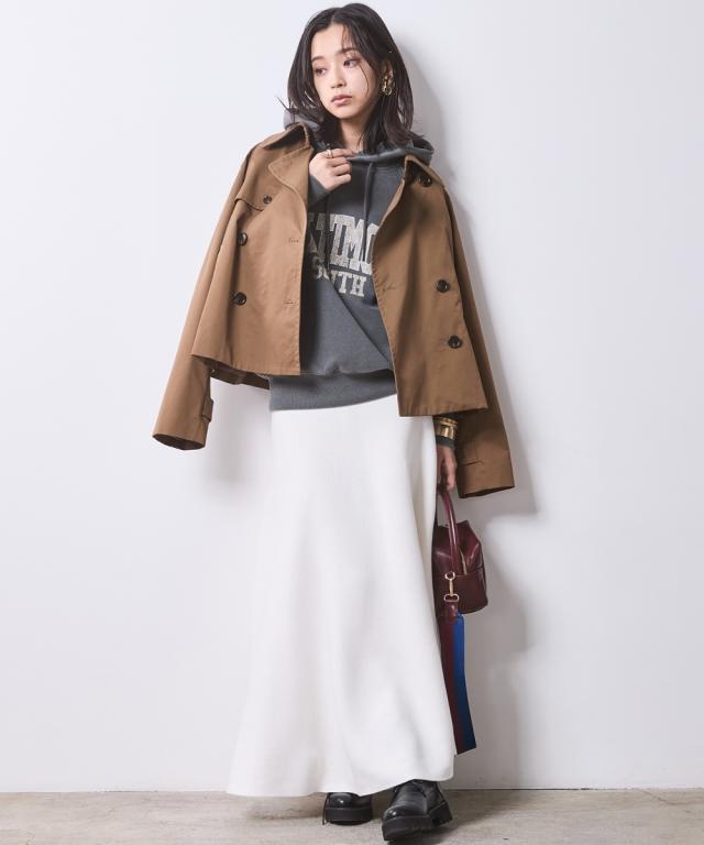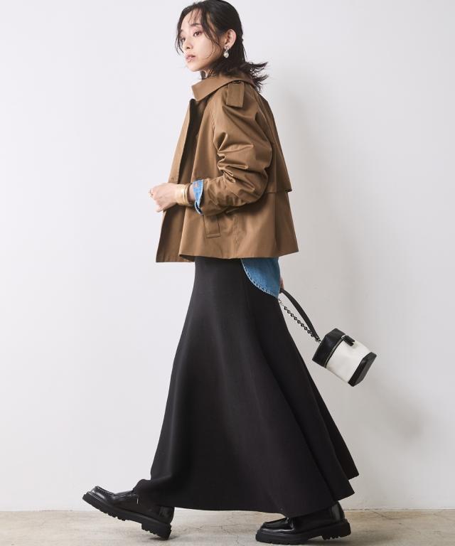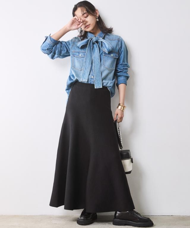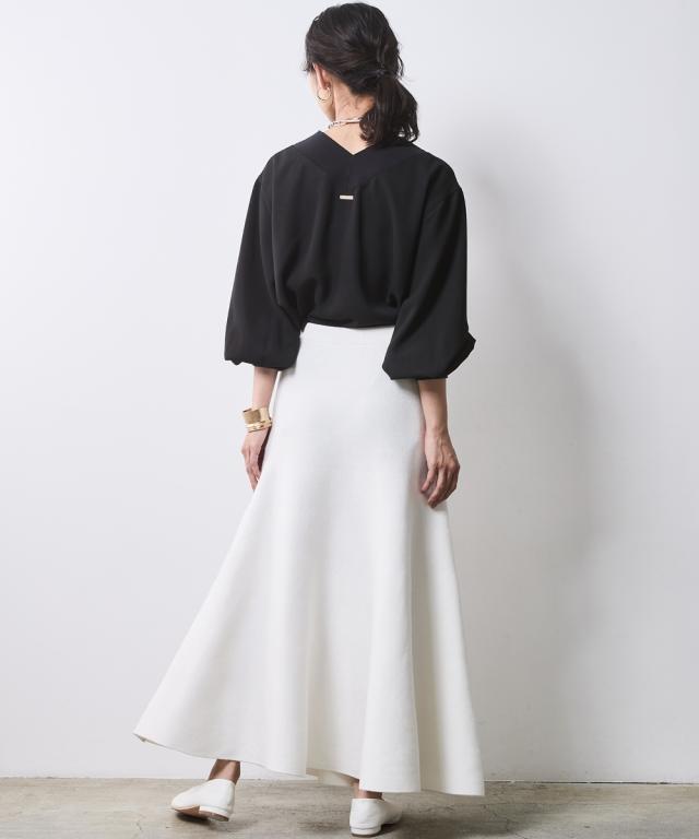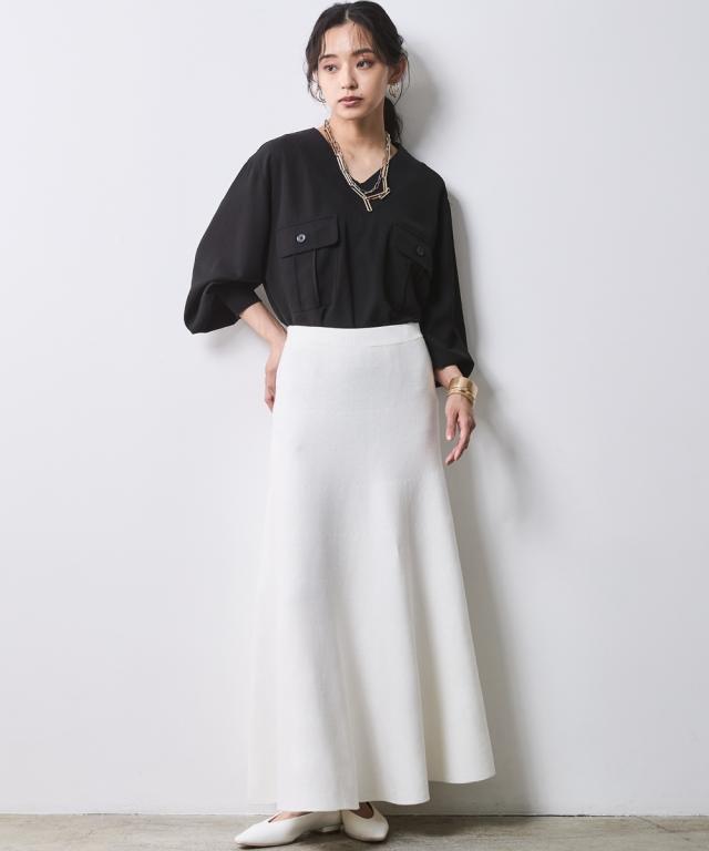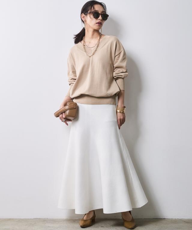 いろんなシーンで活躍するキレイ見えニットフレアスカート。■デザイン 目の詰まったやや肉厚なハイゲージできれいめ見えする一枚。 ウエストからヒップはピッタリ、裾に向かって広がるきれいな細見えシルエット。 スッキリ見えするウエストのゴム仕様もポイント。■素材 綿アクリルの糸を使用した度目のつまったミラノリブ編を使用。■おすすめのスタイリング キレイ目のブラウスや、カジュアルなデニムシャツ等、合わせるアイテム次第で、きれいめにもカジュアルにも決まるニットスカートです。 別売り同素材のニットトップスを合わせるとボーダー+無地、無地+無地のセットアップになります。