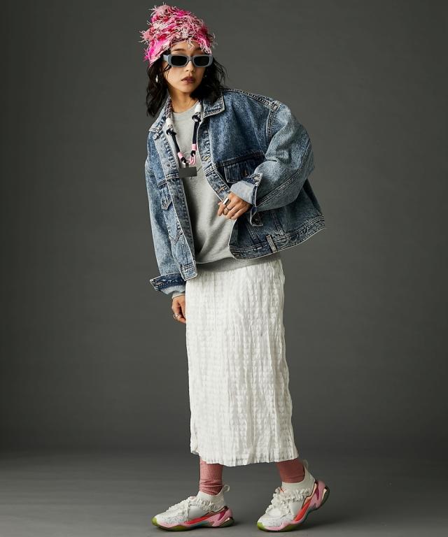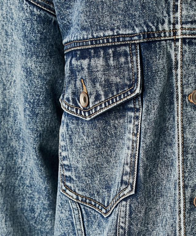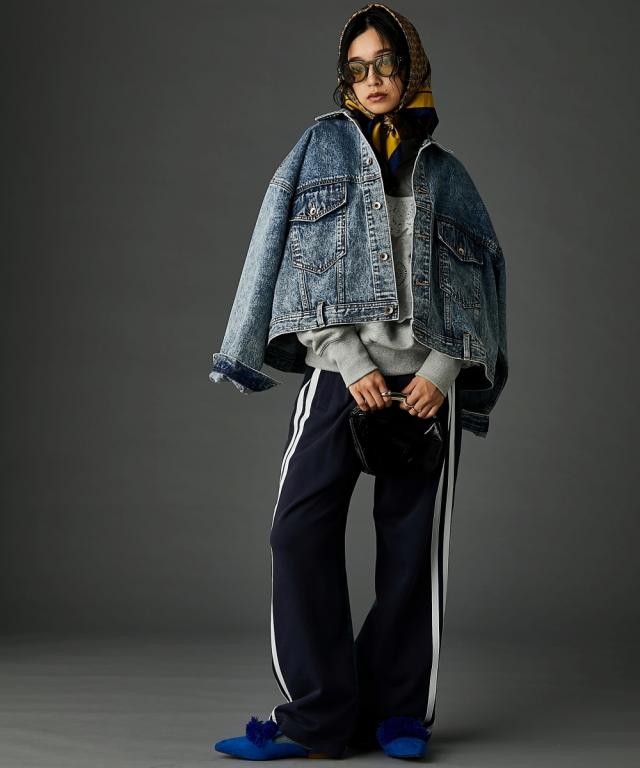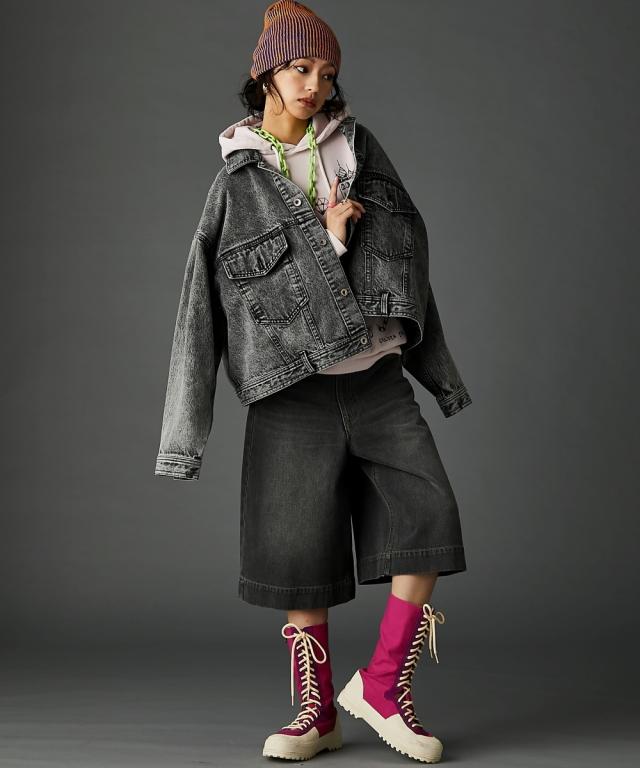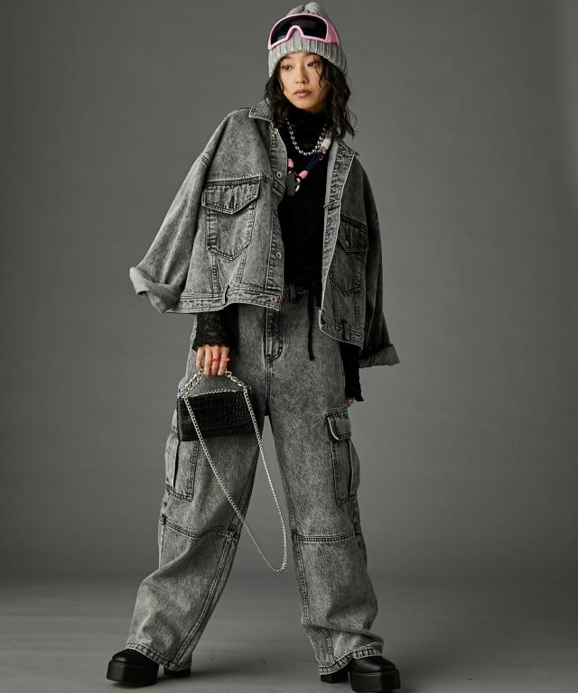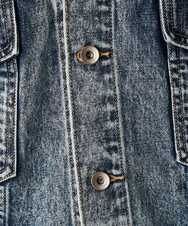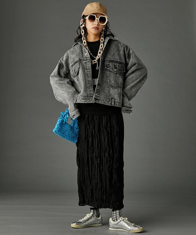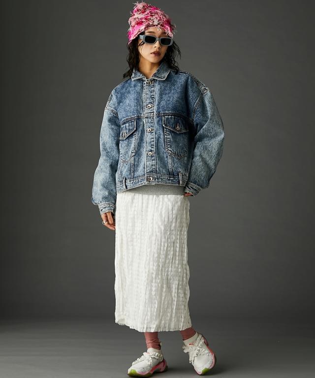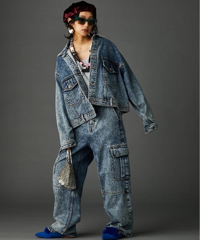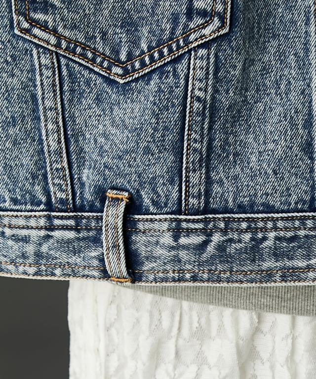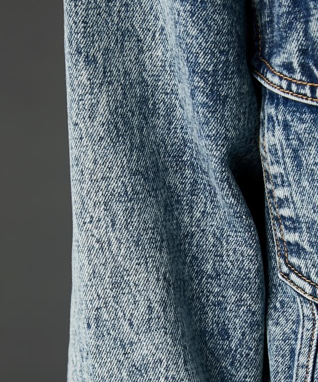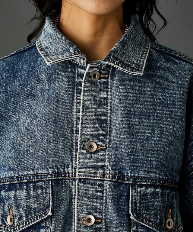 ビッグシルエットが可愛いデニムジャケット。■デザイン 厚手のニットやスウェットの上からでも羽織れるオーバーサイズで、抜け感がありどこから見てもシルエットがかわいいデニムジャケット。 ケミカルウオッシュを施しカラーと加工にこだわった、トレンドとヴィンテージライクなテイストをミックスしたアウター。 スポーツ、ストリート、フェミニン等いろんなテイストに合わせやすいです。■素材 しっかり厚手の綿100%デニム生地を使用。 ヴィンテージライクなブラック・ブルーの2色展開です。■おすすめのスタイリング カジュアルスタイルはもちろんレーススカート等のフェミニンなボトムとも好相性。 別売り同素材のデニムパンツと合わせればセットアップにもなります。